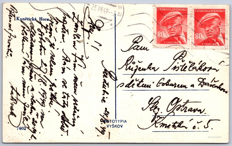 Kunětická hora Pokud chcete vidět pohlednice ve vyšším rozlišení nebo zobrazovat jejich zadní stranu, tak se prosím nejdříve přihlašte Přihlásit Zaregistrovat Kunětická Hora Jazyk tištěného textu na pohlednici: čeština Ráby 6, 533 52 Ráby, Czechia ukázat na mapě Vydavatel: Fototypia - Vyškov (Československo) Odhadované datum vydání pohlednice: 1946 - 1949 Pomozte nám zpřesnit rok vzniku pohlednice Velikost (š x v) a tvar pohlednice: 139 x 87 mm (5.47" x 3.43"), obdélník Prošlá poštou:Datum na razítku: 25.9.1949Datum napsání pohledu: 24.8.1949 Ceny: Vyplacené známky: 1,60 Kčs (CSK) Kódy na pohlednici: 7402 DiskuseVložit příspěvek Přidat novou složku ... Spravovat složky ...