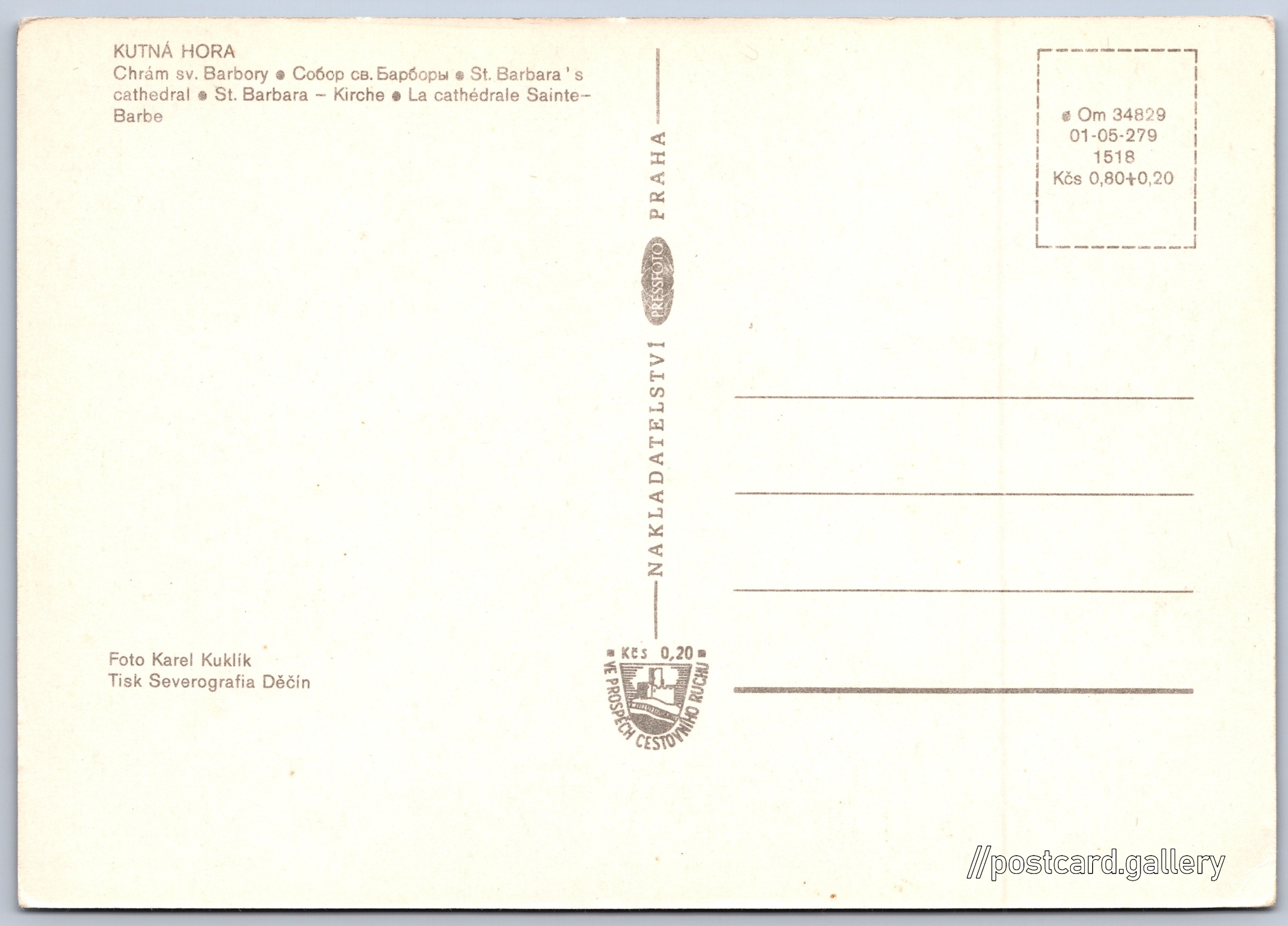 Kutná Hora, chrám sv. Barbory Pokud chcete vidět pohlednice ve vyšším rozlišení nebo zobrazovat jejich zadní stranu, tak se prosím nejdříve přihlašte Přihlásit Zaregistrovat KUTNÁ HORA- Chrám sv. Barbory- Coбop сB. баpборы- St. Barbara's cathedral- St. Barbara - Kirche- La cathédrale Sainte-Barbe Jazyky tištěného textu na pohlednici: čeština, ruština, angličtina, němčina, francouzština Chrám sv. Barbory, Kostel, Kutná Hora-Vnitřní Město, Česko ukázat na mapě Vydavatel: PressFoto Praha (Československo) Rok vydání pohlednice: 1972 Velikost (š x v) a tvar pohlednice: 148 x 105 mm (5.83" x 4.13"), obdélník Osoby spjaté s touto pohlednicí: Karel Kuklík(Autor fotografie) Čistá pohlednice (neprošlá poštou) Ceny: Cena pohlednice: 0,80 Kčs (CSK) (+0,20 Kčs přípl. na tur. ruch) Kódy na pohlednici: •Om 34829 01-05-279 1518 DiskuseVložit příspěvek Přidat novou složku ... Spravovat složky ...