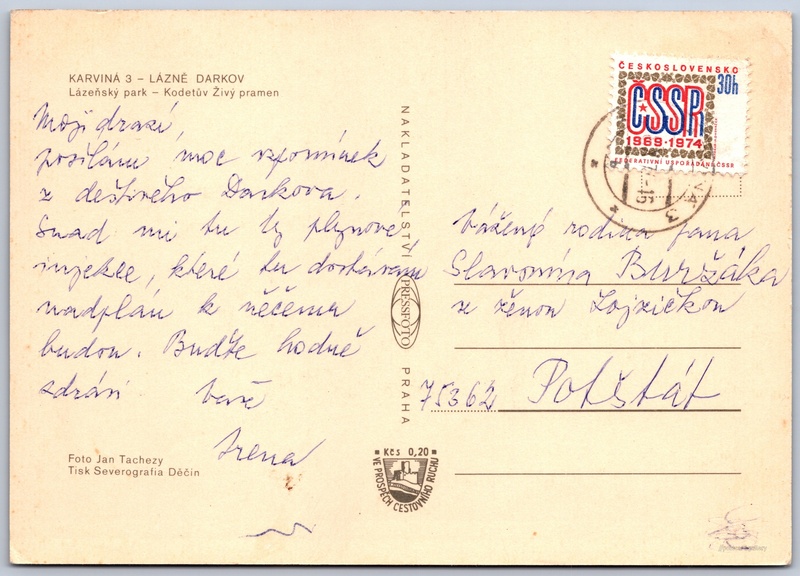 Lázně Darkov, Kodetův pramenn Pokud chcete vidět pohlednice ve vyšším rozlišení nebo zobrazovat jejich zadní stranu, tak se prosím nejdříve přihlašte Přihlásit Zaregistrovat KARVINÁ 3 - LÁZNĚ DARKOVLázeňský park - Kodetův Živý pramen Jazyk tištěného textu na pohlednici: čeština Lázně Darkov, Karviná, Karviná ukázat na mapě V blízkém okolí místa zobrazeného na pohlednici lze najít 4 jiné pohlednice. Zobrazit blízké pohlednice Vydavatel: PressFoto Praha (Československo) Datum vydání není známo Pomozte nám odhadnout datum vzniku pohlednice Velikost (š x v) a tvar pohlednice: 148 x 105 mm (5.83" x 4.13"), obdélník Osoby spjaté s touto pohlednicí: Jan Tachezy(Autor fotografie) Prošlá poštou Ceny: Příplatek na tur. ruch: 0,20 Kčs (CSK))Vyplacené známky: 0,30 Kčs (CSK) DiskuseVložit příspěvek Přidat novou složku ... Spravovat složky ...