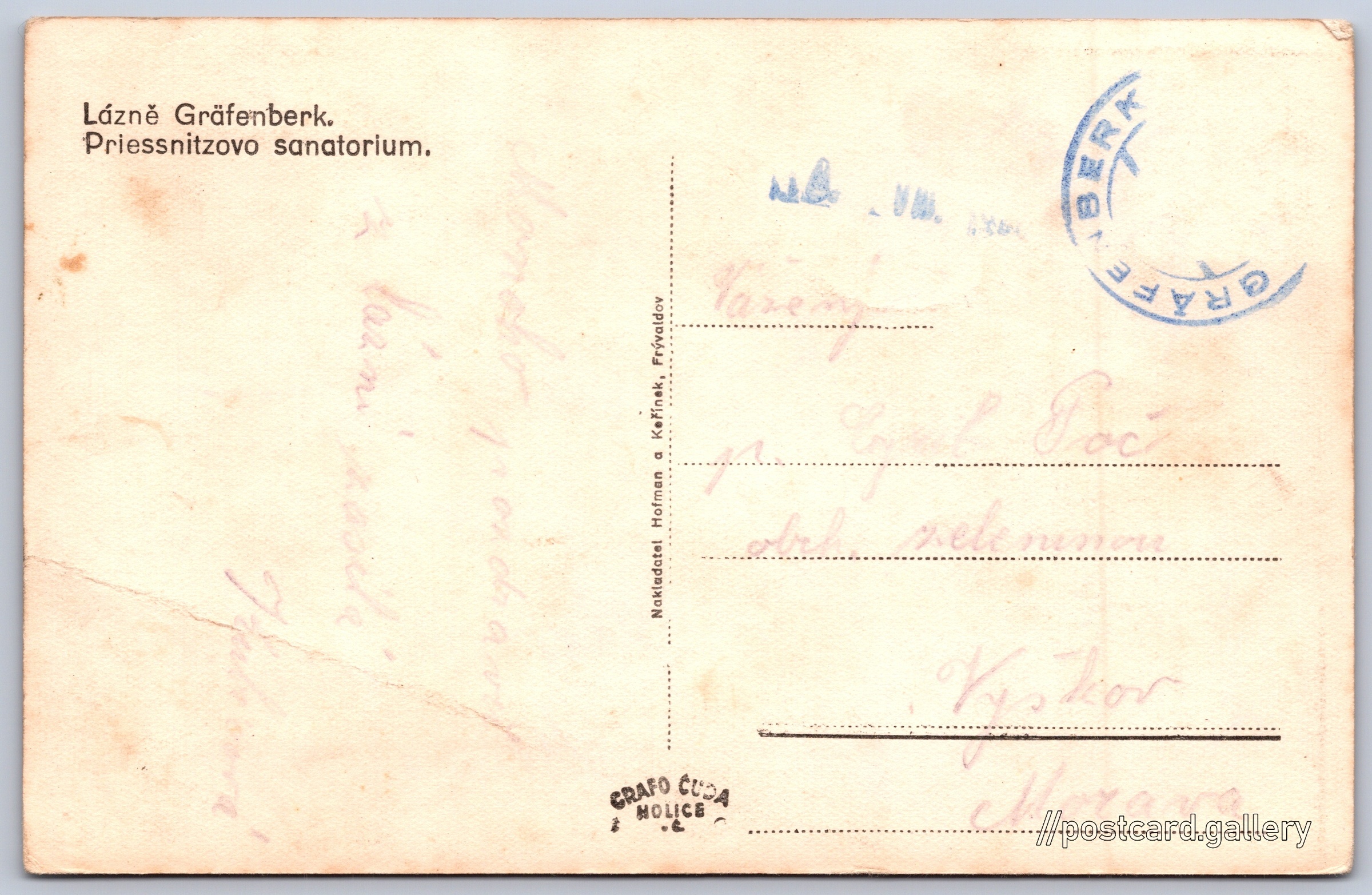 Lázně Gräfenberk, Priessnitzovo sanatorium Pokud chcete vidět pohlednice ve vyšším rozlišení nebo zobrazovat jejich zadní stranu, tak se prosím nejdříve přihlašte Přihlásit Zaregistrovat Lázně Gräfenberk.Priessnitzovo sanatorium. Jazyk tištěného textu na pohlednici: čeština Priessnitzovo sanatorium, Historická budova, Jeseník, Česko ukázat na mapě Vydavatel: Hofman a Kořínek (Československo)Grafo Čuda Holice (Československo) Datum vydání není známo Pomozte nám odhadnout datum vzniku pohlednice Velikost (š x v) a tvar pohlednice: 137 x 89 mm (5.39" x 3.50"), obdélník Prošlá poštou DiskuseVložit příspěvek Přidat novou složku ... Spravovat složky ...