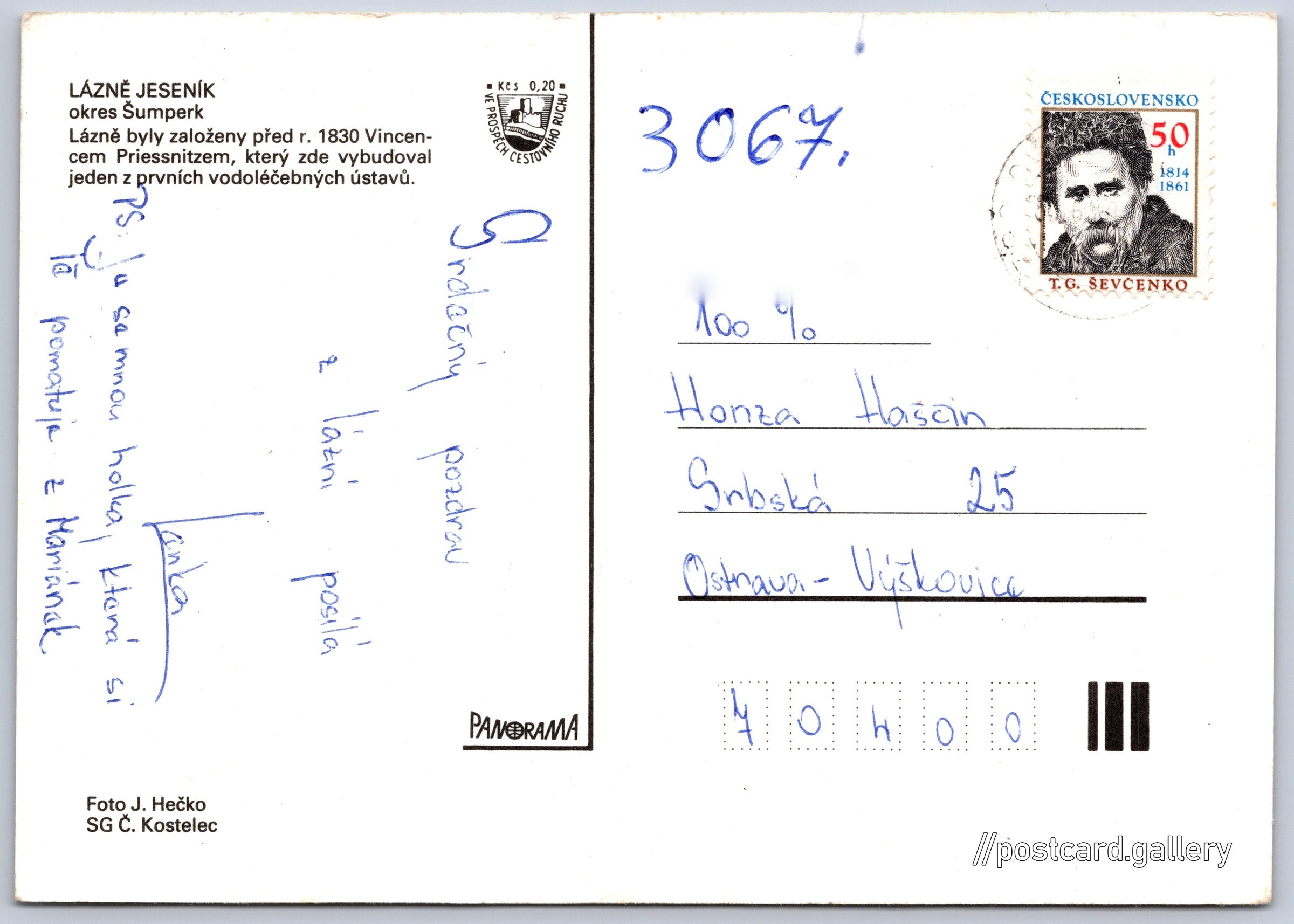 Lázně Jeseník Pokud chcete vidět pohlednice ve vyšším rozlišení nebo zobrazovat jejich zadní stranu, tak se prosím nejdříve přihlašte Přihlásit Zaregistrovat Lázně Jeseník LÁZNĚ JESENÍKokres ŠumperkLázně byly založeny před r. 1830 Vincencem Priessnitzem, který zde vybudoval jeden z prvních vodoléčebných ústavů. Jazyk tištěného textu na pohlednici: čeština Jeseník, Jeseník ukázat na mapě Vydavatel: Panorama (Československo) Odhadované datum vydání pohlednice: 1987 - 1989 Pomozte nám zpřesnit rok vzniku pohlednice Velikost (š x v) a tvar pohlednice: 148 x 105 mm (5.83" x 4.13"), obdélník Osoby spjaté s touto pohlednicí: J. Hečko(Autor fotografie) Vincenc Priessnitz(Obsah pohlednice) Prošlá poštou Ceny: Příplatek na tur. ruch: 0,20 Kčs (CSK))Vyplacené známky: 0,50 Kčs (CSK) DiskuseVložit příspěvek Přidat novou složku ... Spravovat složky ...