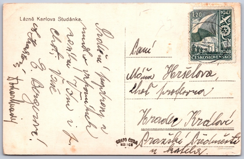Lázně Karlova Studánka Pokud chcete vidět pohlednice ve vyšším rozlišení nebo zobrazovat jejich zadní stranu, tak se prosím nejdříve přihlašte Přihlásit Zaregistrovat Lázně Karlova Studánka. Jazyk tištěného textu na pohlednici: čeština Karlova Studánka, Obec, Česko ukázat na mapě Vydavatel: Grafo Čuda Holice (Československo) Odhadované datum vydání pohlednice: 1945 - 1948 Pomozte nám zpřesnit rok vzniku pohlednice Velikost (š x v) a tvar pohlednice: 137 x 89 mm (5.39" x 3.50"), obdélník Prošlá poštou Ceny: Vyplacené známky: 1,20 Kčs (CSK) DiskuseVložit příspěvek Přidat novou složku ... Spravovat složky ...