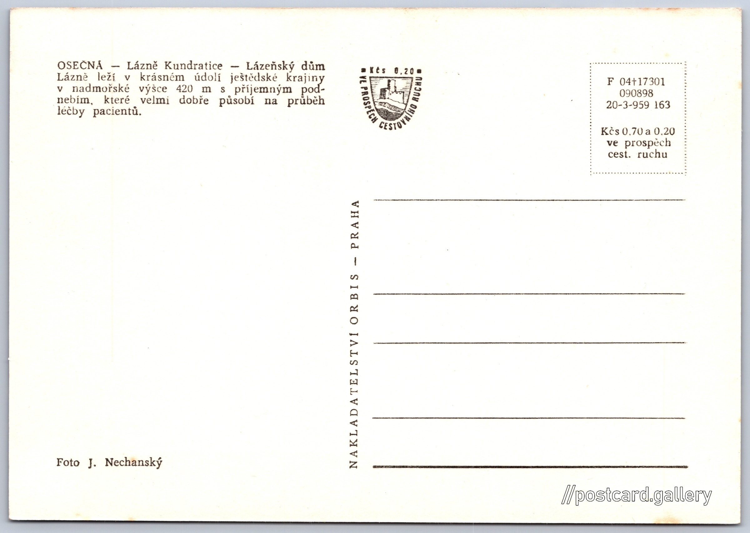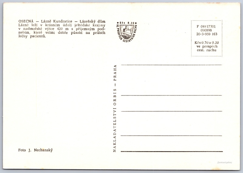 Lázně Kundratice, lázeňský dům Pokud chcete vidět pohlednice ve vyšším rozlišení nebo zobrazovat jejich zadní stranu, tak se prosím nejdříve přihlašte Přihlásit Zaregistrovat Ukázat zadní stranu pohlednice OSEČNÁ - Lázně Kundratice - Lázeňský důmLázně leží v krásném údolí ještědské krajiny v nadmořské výšce 420 m s příjemným podnebím, které velmi dobře působí na průběh léčby pacientů. Jazyk tištěného textu na pohlednici: čeština Lázně Kundratice, Osečná, Liberec ukázat na mapě V blízkém okolí místa zobrazeného na pohlednici lze najít 10 jiných pohlednic. Zobrazit blízké pohlednice Vydavatel: Nakladatelství Orbis (Československo) Rok vydání pohlednice: leden, 1963 Velikost (š x v) a tvar pohlednice: 147 x 103 mm (5.79" x 4.06"), obdélník Osoby spjaté s touto pohlednicí: Jan Nechanský(Autor fotografie) Čistá pohlednice (neprošlá poštou) Ceny: Cena pohlednice: 0,70 Kčs (CSK) (+0,20 Kčs přípl. na tur. ruch) Kódy na pohlednici: F 04+17301 090898 20-3-959 163 DiskuseVložit příspěvek Přidat novou složku ... Spravovat složky ...