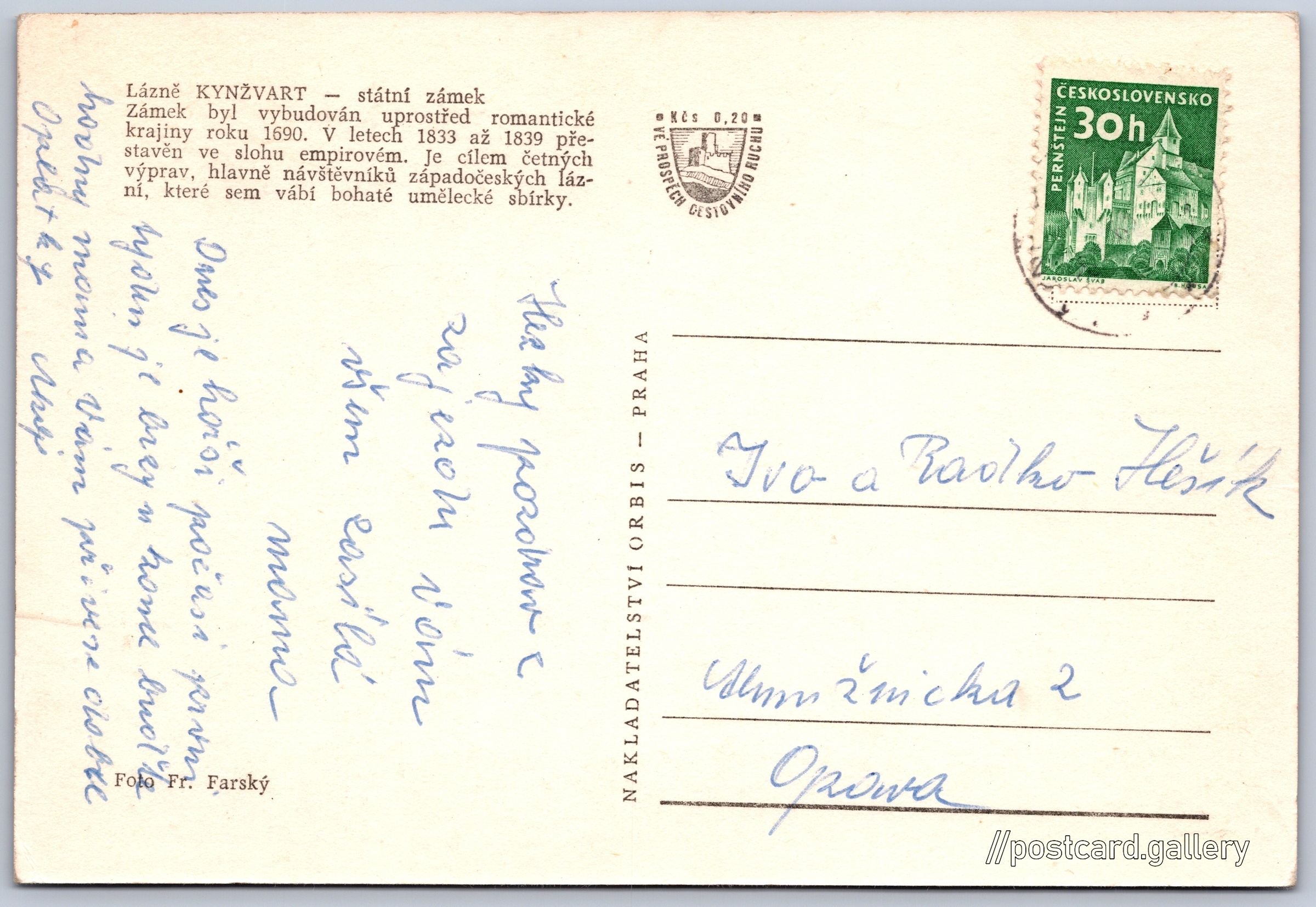 Lázně Kynžvart, státní zámek Pokud chcete vidět pohlednice ve vyšším rozlišení nebo zobrazovat jejich zadní stranu, tak se prosím nejdříve přihlašte Přihlásit Zaregistrovat Lázně KYNŽVART - státní zámekZámek byl vybudován uprostřed romantické krajiny roku 1690. V letech 1833 až 1839 přestavěn ve slohu empirovém. Je cílem četných výprav, hlavně návštěvníků západočeských lázní, které sem vábí bohaté umělecké sbírky. Jazyk tištěného textu na pohlednici: čeština Zámek Kynžvart, Zámek, Zámek 347, Lázně Kynžvart, Česko ukázat na mapě V blízkém okolí místa zobrazeného na pohlednici lze najít 4 jiné pohlednice. Zobrazit blízké pohlednice Vydavatel: Nakladatelství Orbis (Československo) Odhadované datum vydání pohlednice: 1960 - 1965 Pomozte nám zpřesnit rok vzniku pohlednice Velikost (š x v) a tvar pohlednice: 148 x 100 mm (5.83" x 3.94"), obdélník Osoby spjaté s touto pohlednicí: Fr. Farský(Autor fotografie) Prošlá poštou Ceny: Příplatek na tur. ruch: 0,20 Kčs (CSK))Vyplacené známky: 0,30 Kčs (CSK) DiskuseVložit příspěvek Přidat novou složku ... Spravovat složky ...