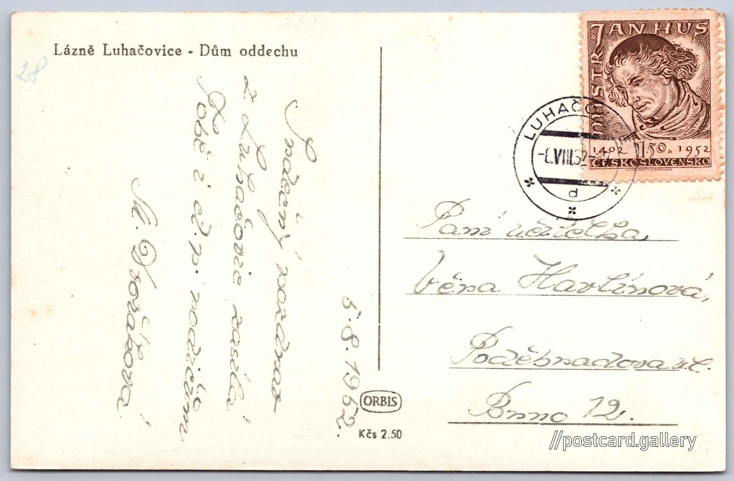 Lázně Luhačovice, Dům oddechu 5/29 Pokud chcete vidět pohlednice ve vyšším rozlišení nebo zobrazovat jejich zadní stranu, tak se prosím nejdříve přihlašte Přihlásit Zaregistrovat Lázně Luhačovice - Dům oddechu Jazyk tištěného textu na pohlednici: čeština Lázeňské náměstí 127, Luhačovice, 763 26, Zlín ukázat na mapě V blízkém okolí místa zobrazeného na pohlednici lze najít 29 jiných pohlednic. Zobrazit blízké pohlednice Vydavatel: Nakladatelství Orbis (Československo) Odhadované datum vydání pohlednice: 1949 - 1952 Pomozte nám zpřesnit rok vzniku pohlednice Velikost (š x v) a tvar pohlednice: 138 x 90 mm (5.43" x 3.54"), obdélník Prošlá poštou:Datum na razítku: 6.8.1952Datum napsání pohledu: 5.8.1952 Ceny: Cena pohlednice: 2,50 Kčs (CSK)Vyplacené známky: 1,50 Kčs (CSK) DiskuseVložit příspěvek Přidat novou složku ... Spravovat složky ...