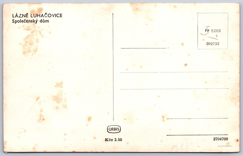 Lázně Luhačovice, Společenský dům Pokud chcete vidět pohlednice ve vyšším rozlišení nebo zobrazovat jejich zadní stranu, tak se prosím nejdříve přihlašte Přihlásit Zaregistrovat LÁZNĚ LUHAČOVICESpolečenský dům Jazyk tištěného textu na pohlednici: čeština Hotel Společenský dům, Lázeňské náměstí 127, Luhačovice, Česko ukázat na mapě V blízkém okolí místa zobrazeného na pohlednici lze najít 29 jiných pohlednic. Zobrazit blízké pohlednice Vydavatel: Nakladatelství Orbis (Československo) Datum vydání není známo Pomozte nám odhadnout datum vzniku pohlednice Velikost (š x v) a tvar pohlednice: 138 x 88 mm (5.43" x 3.46"), obdélník Čistá pohlednice (neprošlá poštou) Ceny: Cena pohlednice: 2,50 Kčs (CSK) Kódy na pohlednici: FP 5203 019732 2704700 DiskuseVložit příspěvek Přidat novou složku ... Spravovat složky ...