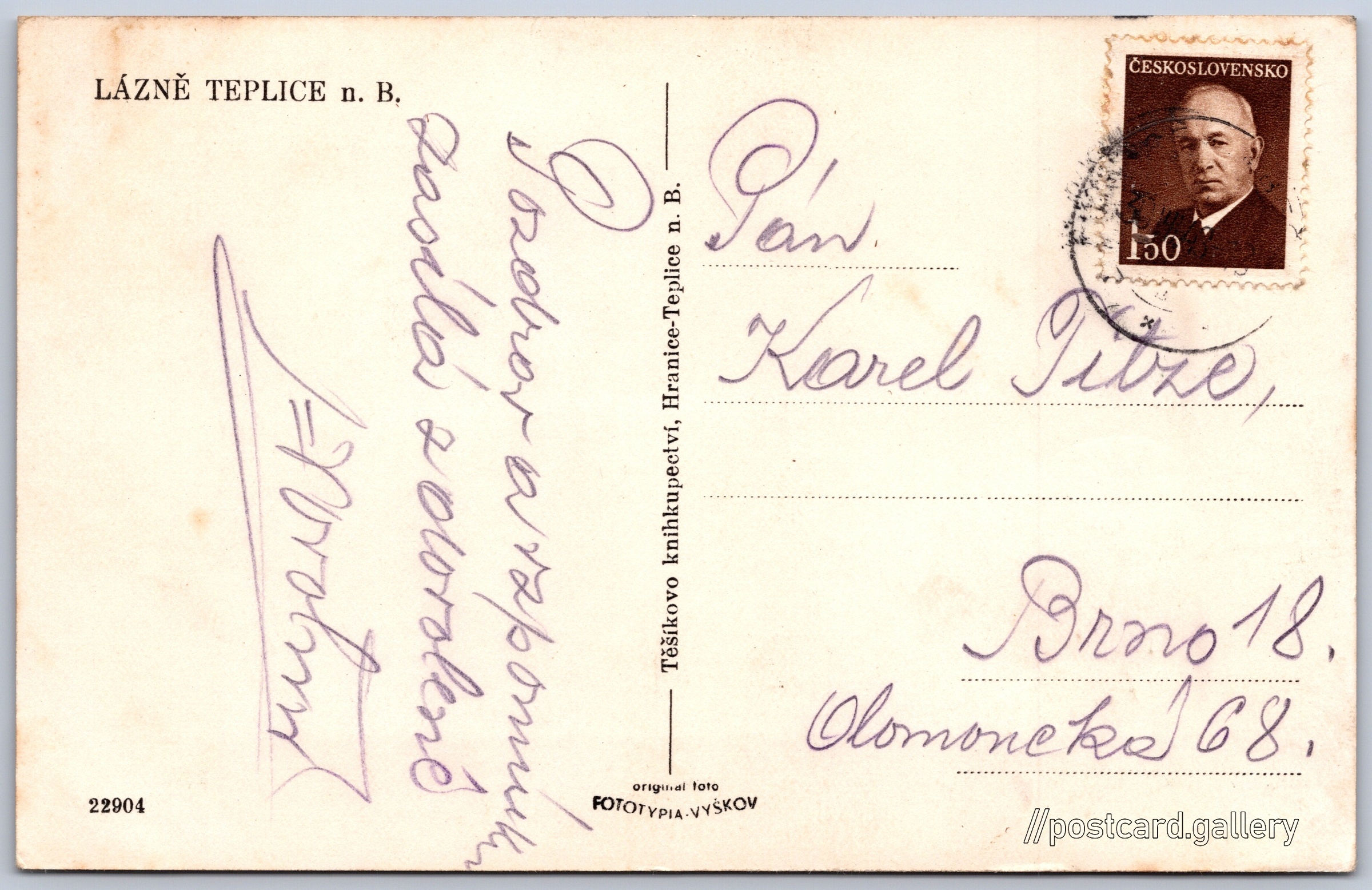 Lázně Teplice nad Bečvou Pokud chcete vidět pohlednice ve vyšším rozlišení nebo zobrazovat jejich zadní stranu, tak se prosím nejdříve přihlašte Přihlásit Zaregistrovat LÁZNĚ TEPLICE n. B. Jazyk tištěného textu na pohlednici: čeština Teplice nad Bečvou, Přerov ukázat na mapě V blízkém okolí místa zobrazeného na pohlednici lze najít 14 jiných pohlednic. Zobrazit blízké pohlednice Vydavatel: Fototypia - Vyškov (Československo) Datum vydání není známo Pomozte nám odhadnout datum vzniku pohlednice Velikost (š x v) a tvar pohlednice: 139 x 89 mm (5.47" x 3.50"), obdélník Prošlá poštou:Datum na razítku: 30.7.1948 Ceny: Vyplacené známky: 1,50 Kčs (CSK) Kódy na pohlednici: 22904 DiskuseVložit příspěvek Přidat novou složku ... Spravovat složky ...