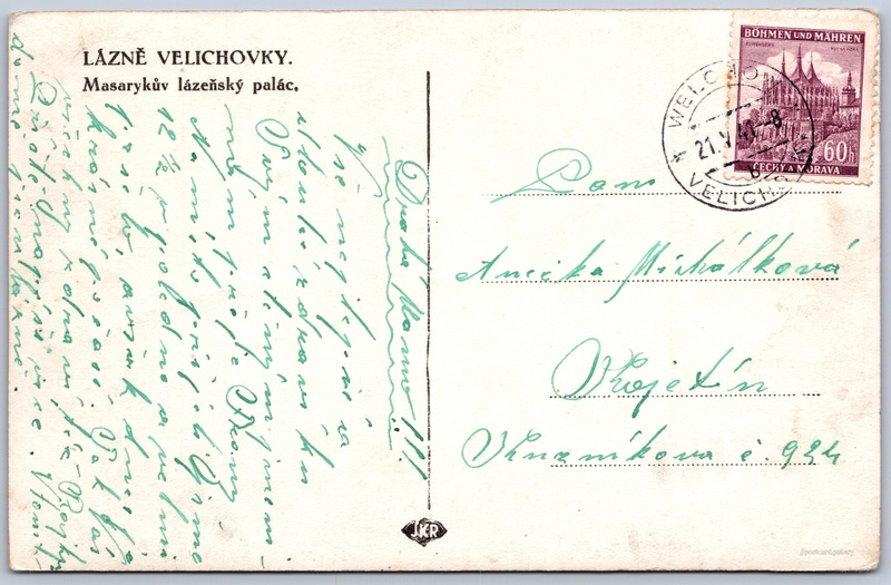 Lázně Velichovky, Masarykův lázeňský palác Pokud chcete vidět pohlednice ve vyšším rozlišení nebo zobrazovat jejich zadní stranu, tak se prosím nejdříve přihlašte Přihlásit Zaregistrovat LÁZNĚ VELICHOVKY.Masarykův lázeňský palác. Jazyk tištěného textu na pohlednici: čeština Velichovky, Náchod ukázat na mapě V blízkém okolí místa zobrazeného na pohlednici lze najít 1 jinou pohlednici. Zobrazit blízké pohlednice Vydavatel: JKR (Československo) Odhadované datum vydání pohlednice: 1935 - 1938 Pomozte nám zpřesnit rok vzniku pohlednice Velikost (š x v) a tvar pohlednice: 140 x 90 mm (5.51" x 3.54"), obdélník Osoby spjaté s touto pohlednicí: Tomáš Garrigue Masaryk(Jméno v názvu místa) Prošlá poštou:Datum na razítku: 21.5.1941 Ceny: Vyplacené známky: 0,60 Kčs (CSK) DiskuseVložit příspěvek Přidat novou složku ... Spravovat složky ...