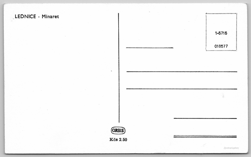 Lednice, minaret Pokud chcete vidět pohlednice ve vyšším rozlišení nebo zobrazovat jejich zadní stranu, tak se prosím nejdříve přihlašte Přihlásit Zaregistrovat LEDNICE - Minaret Jazyk tištěného textu na pohlednici: čeština Minaret Lednice, Rozhledna, Park 434, Lednice, Česko ukázat na mapě V blízkém okolí místa zobrazeného na pohlednici lze najít 18 jiných pohlednic. Zobrazit blízké pohlednice Vydavatel: Nakladatelství Orbis (Československo) Datum vydání není známo Pomozte nám odhadnout datum vzniku pohlednice Velikost (š x v) a tvar pohlednice: 138 x 86 mm (5.43" x 3.39"), obdélník Čistá pohlednice (neprošlá poštou) Ceny: Cena pohlednice: 2,50 Kčs (CSK) Kódy na pohlednici: 1-5715 018577 DiskuseVložit příspěvek Přidat novou složku ... Spravovat složky ...