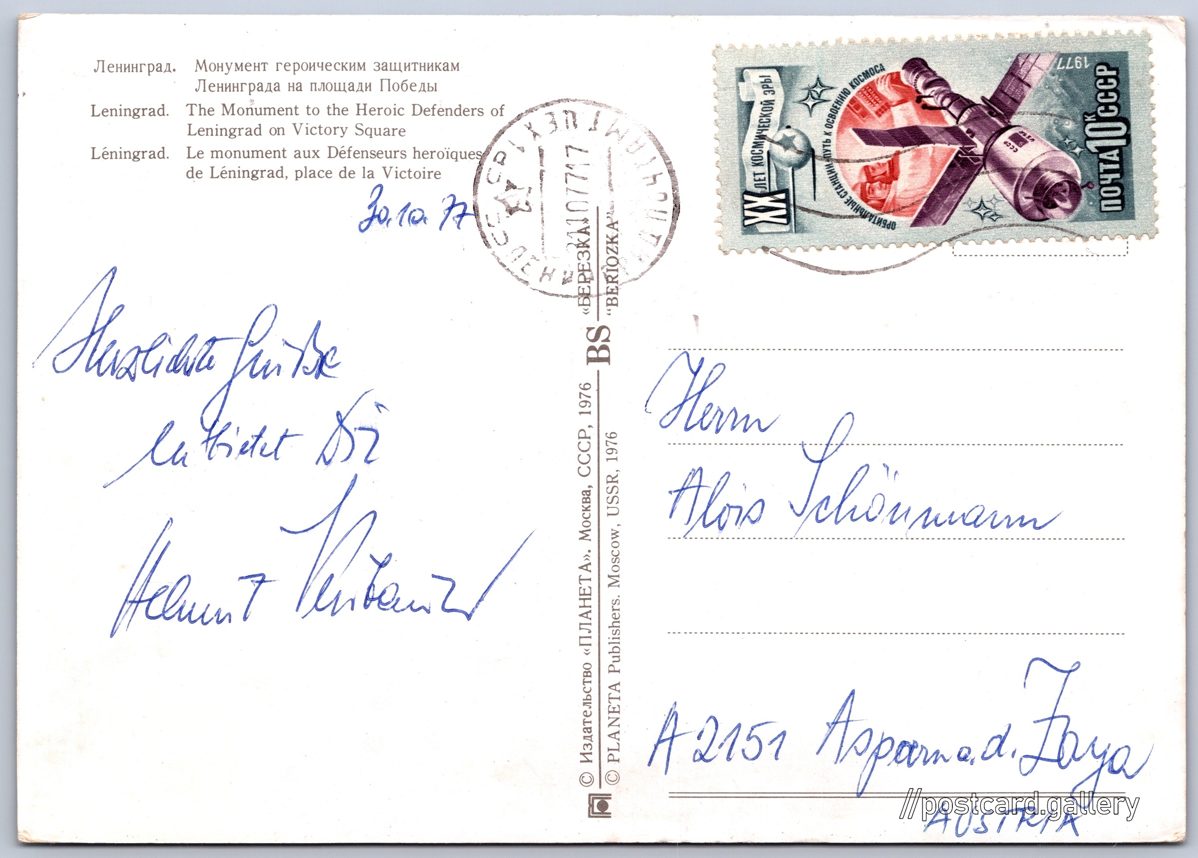 Leningrad, památník obráncům Pokud chcete vidět pohlednice ve vyšším rozlišení nebo zobrazovat jejich zadní stranu, tak se prosím nejdříve přihlašte Přihlásit Zaregistrovat - Ленинград. Монумент героическим защитникам Ленинграда на площади Победы- Leningrad. The Monument to the Heroic Defenders of Leningrad on Victory Square- Léningrad. Le monument aux Défenseurs heroïques de Léningrad, place de la Victoire Jazyk tištěného textu na pohlednici: ruština Monument to the Heroic Defenders of Leningrad on Victory Square, Pomník, památník, Ploŝadʹ Pobedy с1, Petrohrad - Pulkovsky Meridian Municipal Okrug, Rusko ukázat na mapě Vydavatel: Planeta Publishers (Sovětský svaz) Rok vydání pohlednice: 1976 Velikost (š x v) a tvar pohlednice: 148 x 104 mm (5.83" x 4.09"), obdélník Prošlá poštou:Datum na razítku: 31.7.1977Datum napsání pohledu: 30.10.1977 Ceny: Vyplacené známky: 0,10 руб (SUR) DiskuseVložit příspěvek Přidat novou složku ... Spravovat složky ...