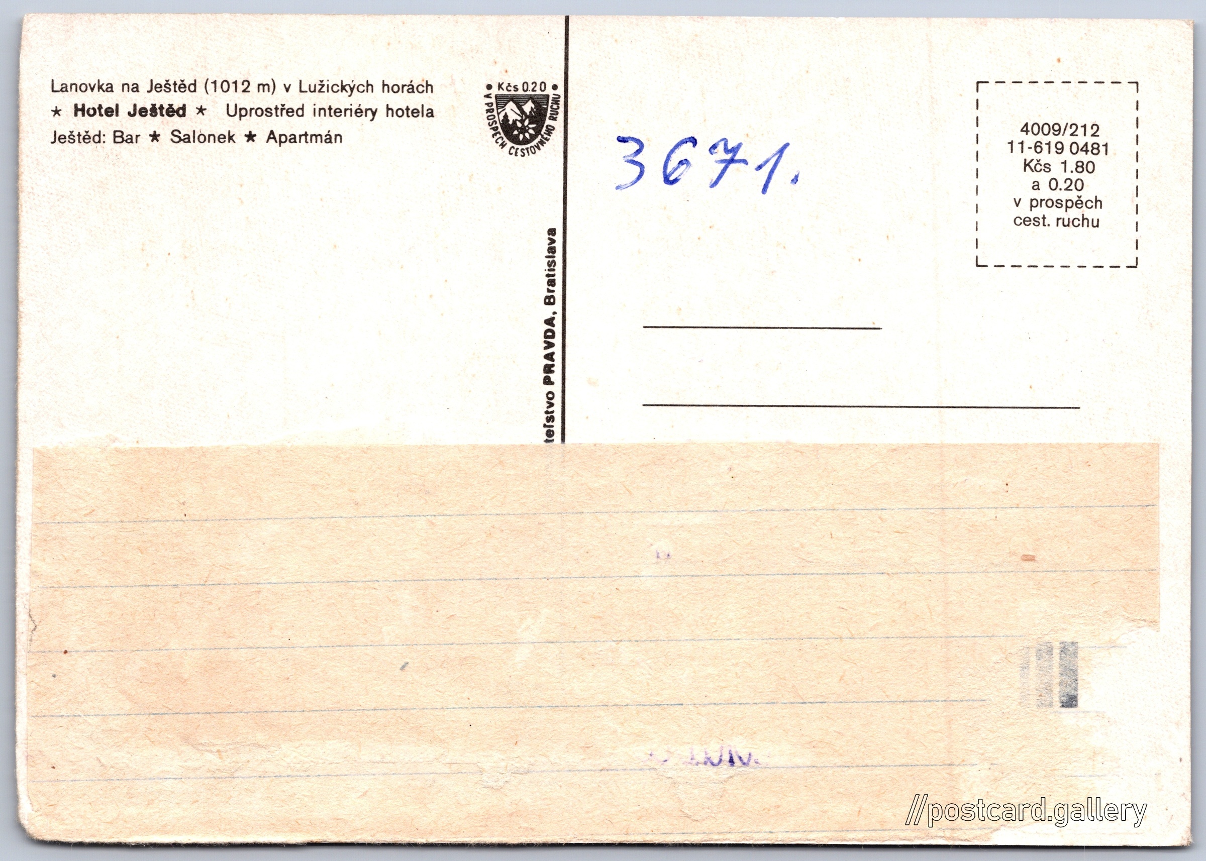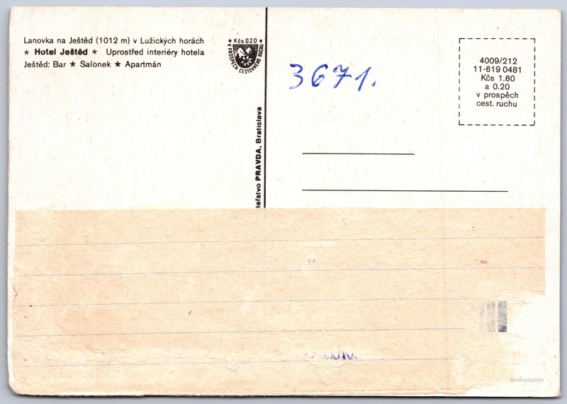Liberec, Ještěd Pokud chcete vidět pohlednice ve vyšším rozlišení nebo zobrazovat jejich zadní stranu, tak se prosím nejdříve přihlašte Přihlásit Zaregistrovat LiberecJeštěd Lanovka na Ještěd (1012 m) v Lužických horách- Hotel Ještěd- Uprostřed interiéry hotela- Ještěd: Bar- Salonek- Apartmán Jazyk tištěného textu na pohlednici: čeština Rozhledna Ještěd, Rozhledna, Liberec XIX-Horní Hanychov 153, Liberec XIX-Horní Hanychov, Česko ukázat na mapě Vydavatel: Nakladateľstvo PRAVDA, Bratislava (Československo) Rok vydání pohlednice: duben, 1981 Velikost (š x v) a tvar pohlednice: 145 x 103 mm (5.71" x 4.06"), obdélník Čistá pohlednice (neprošlá poštou) Ceny: Cena pohlednice: 1,80 Kčs (CSK) (+0,20 Kčs přípl. na tur. ruch) Kódy na pohlednici: 4009/212 11-619 0481 DiskuseVložit příspěvek Přidat novou složku ... Spravovat složky ...