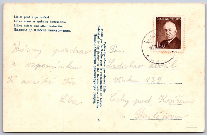 Lidice před a po zničení Pokud chcete vidět pohlednice ve vyšším rozlišení nebo zobrazovat jejich zadní stranu, tak se prosím nejdříve přihlašte Přihlásit Zaregistrovat - Lidice před a po zničení.- Lidice avant et après sa destruction.- Lidice before and after destruction,- Лидицы до и после уничтожения. Jazyky tištěného textu na pohlednici: čeština, francouzština, angličtina, ruština Lidice, Kladno ukázat na mapě V blízkém okolí místa zobrazeného na pohlednici lze najít 3 jiné pohlednice. Zobrazit blízké pohlednice Vydavatel: Společnost pro obnovu Lidic (Československo) Odhadované datum vydání pohlednice: 1947 - 1950 Pomozte nám zpřesnit rok vzniku pohlednice Velikost (š x v) a tvar pohlednice: 139 x 89 mm (5.47" x 3.50"), obdélník Prošlá poštou:Datum na razítku: 13.9.1950 Ceny: Vyplacené známky: 1,50 Kčs (CSK) Kódy na pohlednici: 3 DiskuseVložit příspěvek Přidat novou složku ... Spravovat složky ...