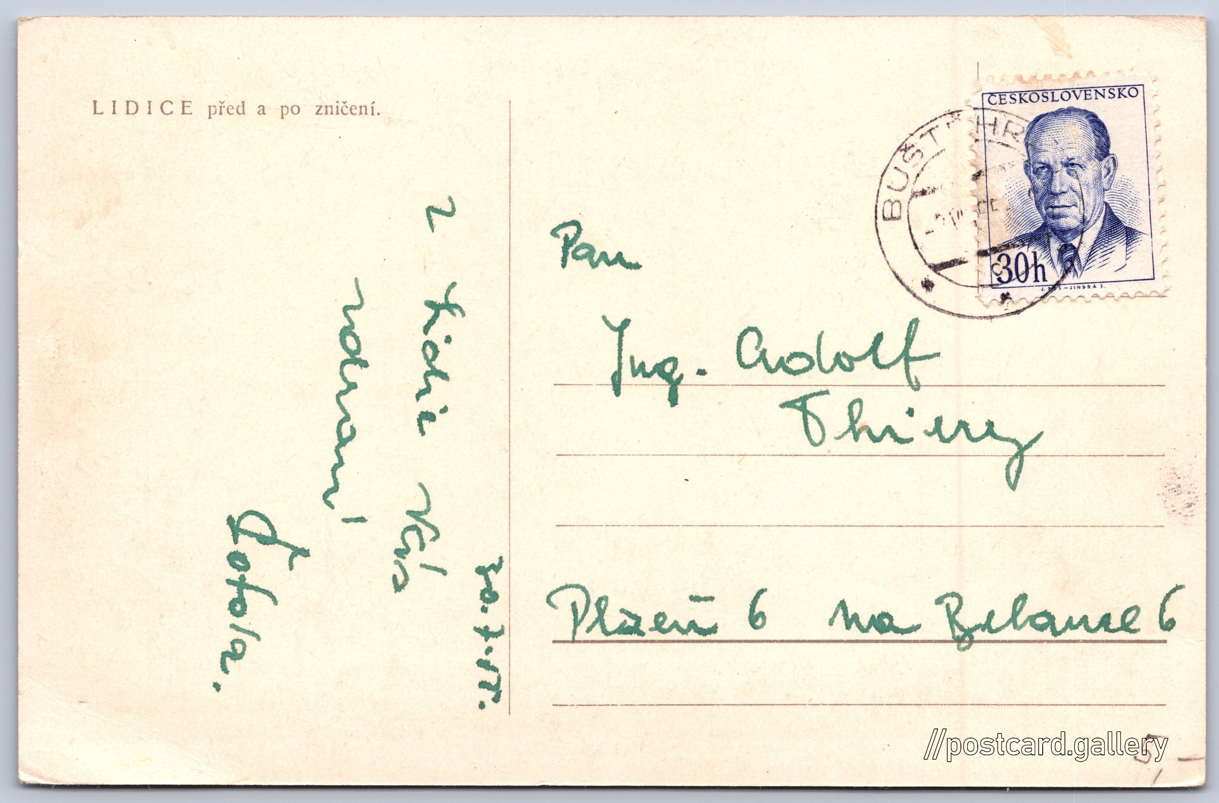 Lidice před a po zničení Pokud chcete vidět pohlednice ve vyšším rozlišení nebo zobrazovat jejich zadní stranu, tak se prosím nejdříve přihlašte Přihlásit Zaregistrovat Ukázat zadní stranu pohlednice LIDICE před a po zničení. Jazyk tištěného textu na pohlednici: čeština 46R2+M7 Lidice, Czechia ukázat na mapě Odhadované datum vydání pohlednice: 1952 - 1955 Pomozte nám zpřesnit rok vzniku pohlednice Velikost (š x v) a tvar pohlednice: 139 x 91 mm (5.47" x 3.58"), obdélník Prošlá poštou:Datum na razítku: 2.8.1955Datum napsání pohledu: 30.7.1955 Ceny: Vyplacené známky: 0,30 Kčs (CSK) DiskuseVložit příspěvek Přidat novou složku ... Spravovat složky ...
