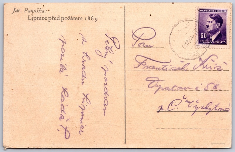 Lipnice před požárem 1869, obraz Jar. Panušky Pokud chcete vidět pohlednice ve vyšším rozlišení nebo zobrazovat jejich zadní stranu, tak se prosím nejdříve přihlašte Přihlásit Zaregistrovat Jar. Panuška:Lipnice před požárem 1869 Jazyk tištěného textu na pohlednici: čeština Lipnice nad Sázavou 205, Lipnice nad Sázavou, 582 32, Havlíčkův Brod ukázat na mapě V blízkém okolí místa zobrazeného na pohlednici lze najít 4 jiné pohlednice. Zobrazit blízké pohlednice Odhadované datum vydání pohlednice: 1941 - 1944 Pomozte nám zpřesnit rok vzniku pohlednice Velikost (š x v) a tvar pohlednice: 139 x 89 mm (5.47" x 3.50"), obdélník Osoby spjaté s touto pohlednicí: Jaroslav Panuška(Autor předlohy) Prošlá poštou:Datum na razítku: 14.8.1944 Ceny: Vyplacené známky: 0,60 ℛℳ (RM) DiskuseVložit příspěvek Přidat novou složku ... Spravovat složky ...