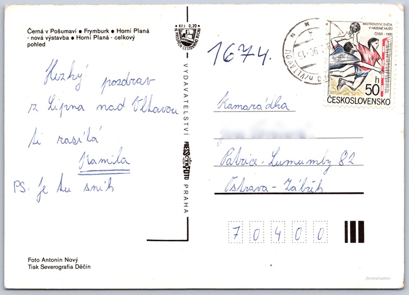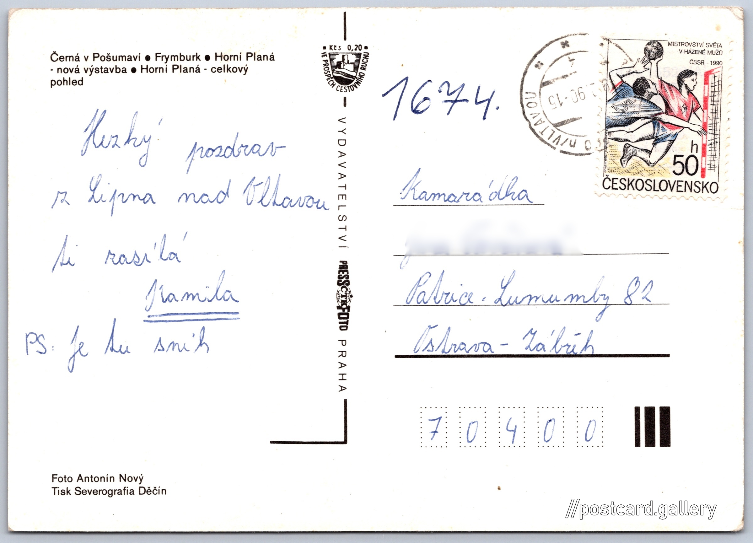 Lipno Pokud chcete vidět pohlednice ve vyšším rozlišení nebo zobrazovat jejich zadní stranu, tak se prosím nejdříve přihlašte Přihlásit Zaregistrovat Lipno - Černá v Pošumaví- Frymburk- Horní Planá - nová výstavba- Horní Planá - celkový pohled Jazyk tištěného textu na pohlednici: čeština Černá v Pošumaví, Český Krumlov ukázat na mapě Vydavatel: PressFoto Praha (Československo) Odhadované datum vydání pohlednice: 1987 - 1990 Pomozte nám zpřesnit rok vzniku pohlednice Velikost (š x v) a tvar pohlednice: 148 x 105 mm (5.83" x 4.13"), obdélník Osoby spjaté s touto pohlednicí: Antonín E. Nový(Autor fotografie) Prošlá poštou:Datum na razítku: 18.2.1990 Ceny: Příplatek na tur. ruch: 0,20 Kčs (CSK))Vyplacené známky: 0,50 Kčs (CSK) DiskuseVložit příspěvek Přidat novou složku ... Spravovat složky ...