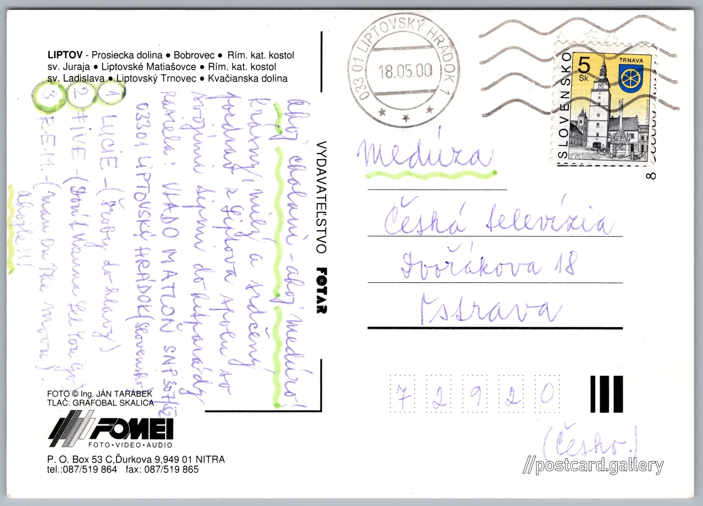 Liptov 3/3 Pokud chcete vidět pohlednice ve vyšším rozlišení nebo zobrazovat jejich zadní stranu, tak se prosím nejdříve přihlašte Přihlásit Zaregistrovat Liptov LIPTOV- Prosiecka dolina- Bobrovec- Rím. kat. kostol sv. Juraja- Liptovské Matiašovce- Rím. kat. kostol Liptovský Trnovec- Kvačianska dolina Jazyk tištěného textu na pohlednici: slovenština Kvačianska dolina, Chráněné území, Kvačany 234, Kvačany, Žilinský kraj, Slovensko ukázat na mapě V blízkém okolí místa zobrazeného na pohlednici lze najít 3 jiné pohlednice. Zobrazit blízké pohlednice Vydavatel: FOTAR (Slovensko) Odhadované datum vydání pohlednice: 1997 - 2000 Pomozte nám zpřesnit rok vzniku pohlednice Velikost (š x v) a tvar pohlednice: 148 x 106 mm (5.83" x 4.17"), obdélník Osoby spjaté s touto pohlednicí: Ing. Jan Tarábek(Autor fotografie) Prošlá poštou:Datum na razítku: 18.5.2000 Ceny: Vyplacené známky: 5,00 Sk (SKK) DiskuseVložit příspěvek Přidat novou složku ... Spravovat složky ...