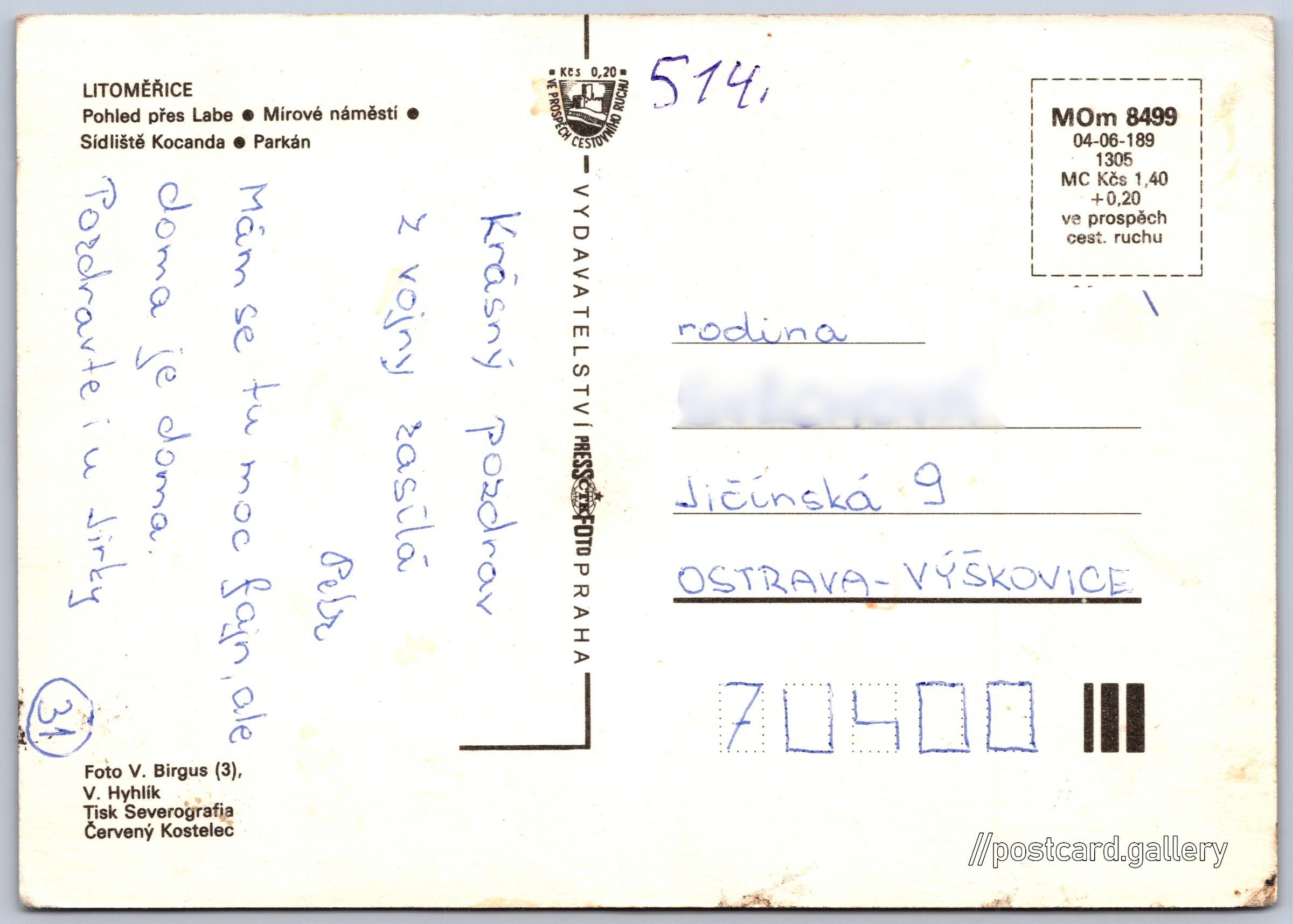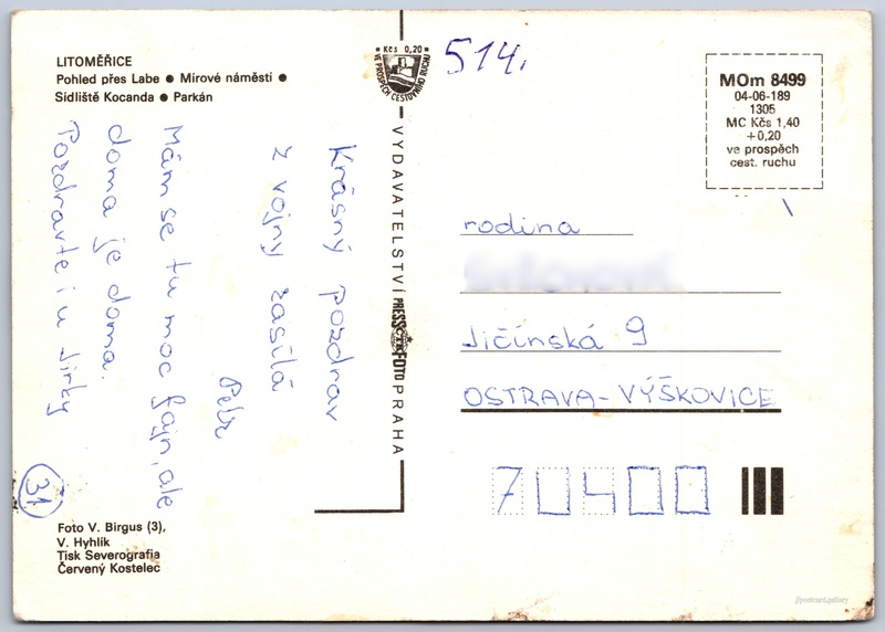 Litoměřice Pokud chcete vidět pohlednice ve vyšším rozlišení nebo zobrazovat jejich zadní stranu, tak se prosím nejdříve přihlašte Přihlásit Zaregistrovat Litoměřice LITOMĚŘICE- Pohled přes Labe- Mírové náměstí- Sídliště Kocanda- Parkán Jazyk tištěného textu na pohlednici: čeština Předměstí, Litoměřice, Litoměřice ukázat na mapě Vydavatel: PressFoto Praha (Československo) Rok vydání pohlednice: 1981 Velikost (š x v) a tvar pohlednice: 148 x 105 mm (5.83" x 4.13"), obdélník Osoby spjaté s touto pohlednicí: Vladimír Hyhlík(Autor fotografie) Vladimír Birgus(Autor fotografie) Prošlá poštou Ceny: Cena pohlednice: 1,40 Kčs (CSK) (+0,20 Kčs přípl. na tur. ruch) Kódy na pohlednici: MOm 8499 04-06-189 1305 DiskuseVložit příspěvek Přidat novou složku ... Spravovat složky ...