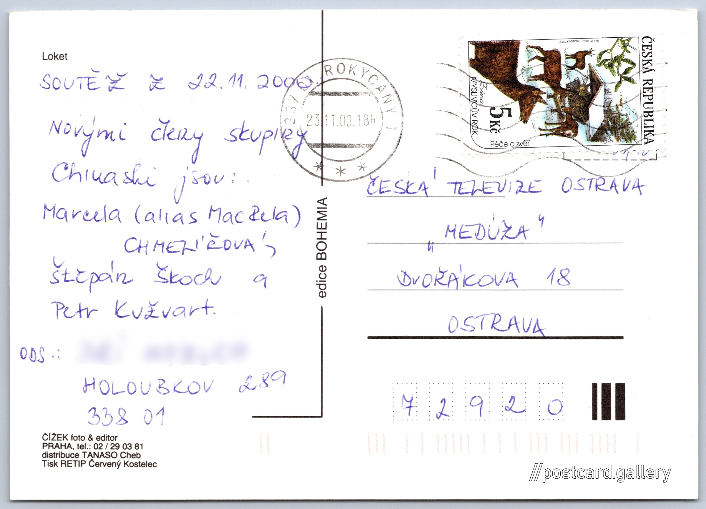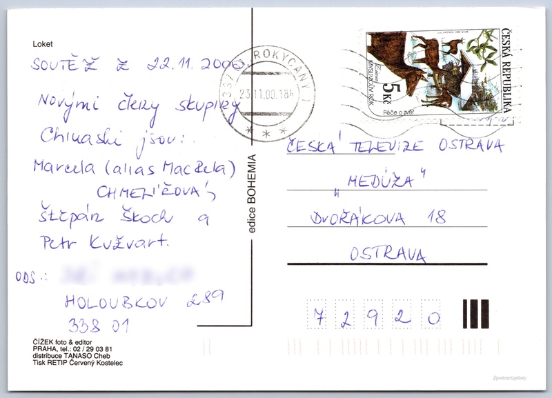 Loket, letecký pohled Pokud chcete vidět pohlednice ve vyšším rozlišení nebo zobrazovat jejich zadní stranu, tak se prosím nejdříve přihlašte Přihlásit Zaregistrovat Loket Jazyk tištěného textu na pohlednici: čeština Loket, Město, Karlovarský kraj, Česko ukázat na mapě Vydavatel: TANASO Cheb (Česko) Odhadované datum vydání pohlednice: 2000 - 2003 Pomozte nám zpřesnit rok vzniku pohlednice Velikost (š x v) a tvar pohlednice: 147 x 105 mm (5.79" x 4.13"), obdélník Prošlá poštou:Datum na razítku: 23.11.2003 Ceny: Vyplacené známky: 5,00 Kč (CZK) DiskuseVložit příspěvek Přidat novou složku ... Spravovat složky ...