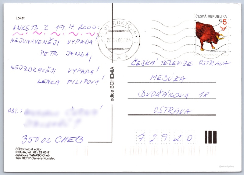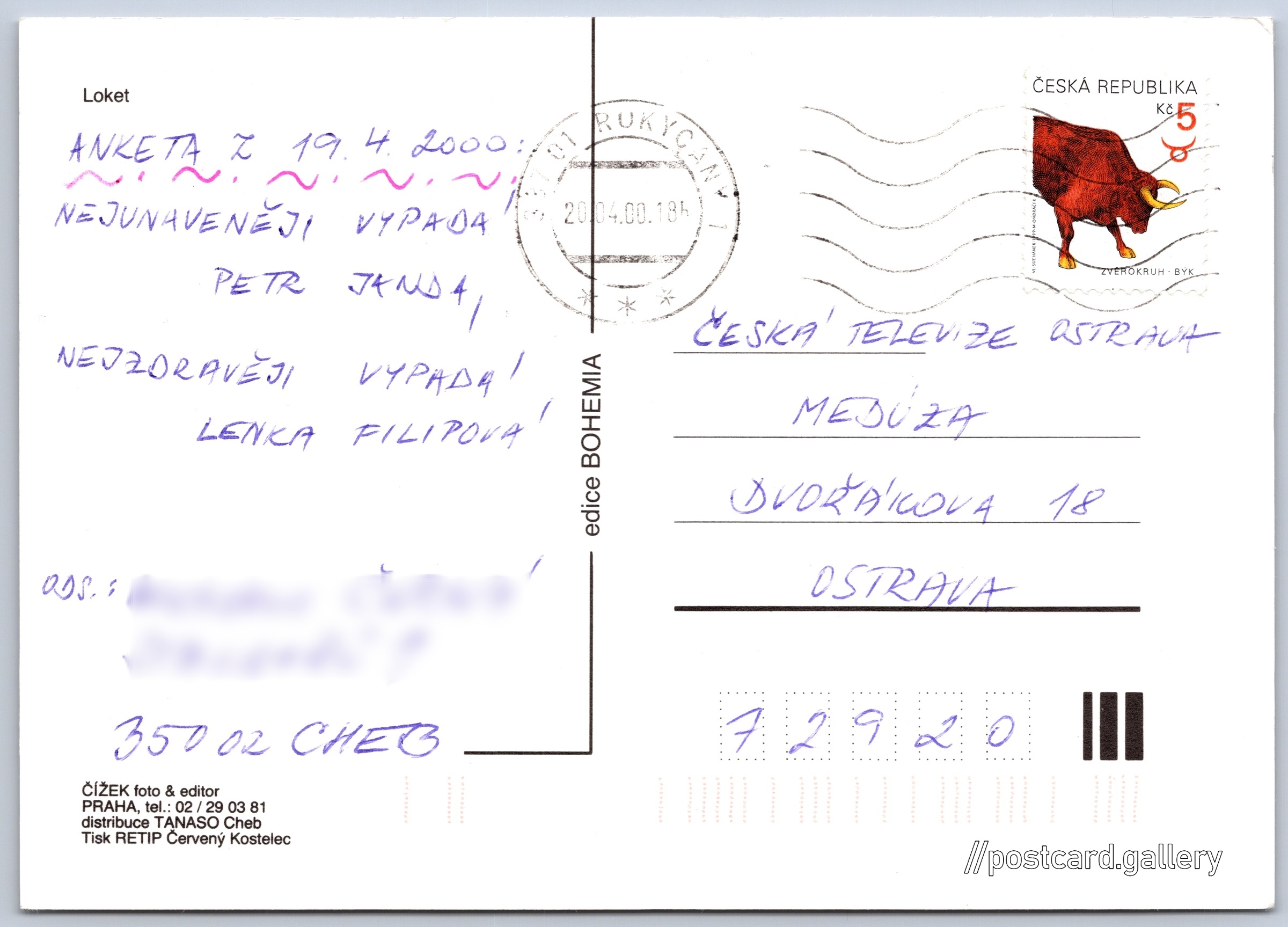Loket, letecký pohled Pokud chcete vidět pohlednice ve vyšším rozlišení nebo zobrazovat jejich zadní stranu, tak se prosím nejdříve přihlašte Přihlásit Zaregistrovat Loket Jazyk tištěného textu na pohlednici: čeština Loket, Město, Karlovarský kraj, Česko ukázat na mapě Vydavatel: TANASO Cheb (Česko) Odhadované datum vydání pohlednice: 1997 - 2000 Pomozte nám zpřesnit rok vzniku pohlednice Velikost (š x v) a tvar pohlednice: 148 x 105 mm (5.83" x 4.13"), obdélník Prošlá poštou:Datum na razítku: 20.4.2000 Ceny: Vyplacené známky: 5,00 Kč (CZK) DiskuseVložit příspěvek Přidat novou složku ... Spravovat složky ...