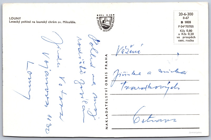 Louny, chrám sv. Mikuláše Pokud chcete vidět pohlednice ve vyšším rozlišení nebo zobrazovat jejich zadní stranu, tak se prosím nejdříve přihlašte Přihlásit Zaregistrovat LOUNYLetecký pohled na lounský chrám sv. Mikuláše. Jazyk tištěného textu na pohlednici: čeština Kostel sv. Mikuláše, Kostel, Beneše z Loun, Louny, Česko ukázat na mapě V blízkém okolí místa zobrazeného na pohlednici lze najít 1 jinou pohlednici. Zobrazit blízké pohlednice Vydavatel: Nakladatelství Orbis (Československo) Datum vydání není známo Pomozte nám odhadnout datum vzniku pohlednice Velikost (š x v) a tvar pohlednice: 147 x 95 mm (5.79" x 3.74"), obdélník Prošlá poštou Ceny: Cena pohlednice: 0,80 Kčs (CSK) (+0,20 Kčs přípl. na tur. ruch) Kódy na pohlednici: 20-6-300 8-67 B 1835 F 04*70705 DiskuseVložit příspěvek Přidat novou složku ... Spravovat složky ...