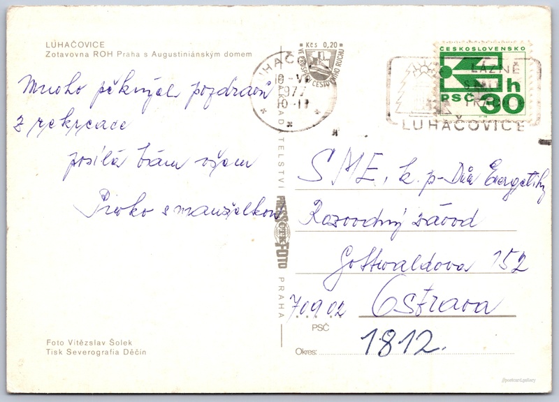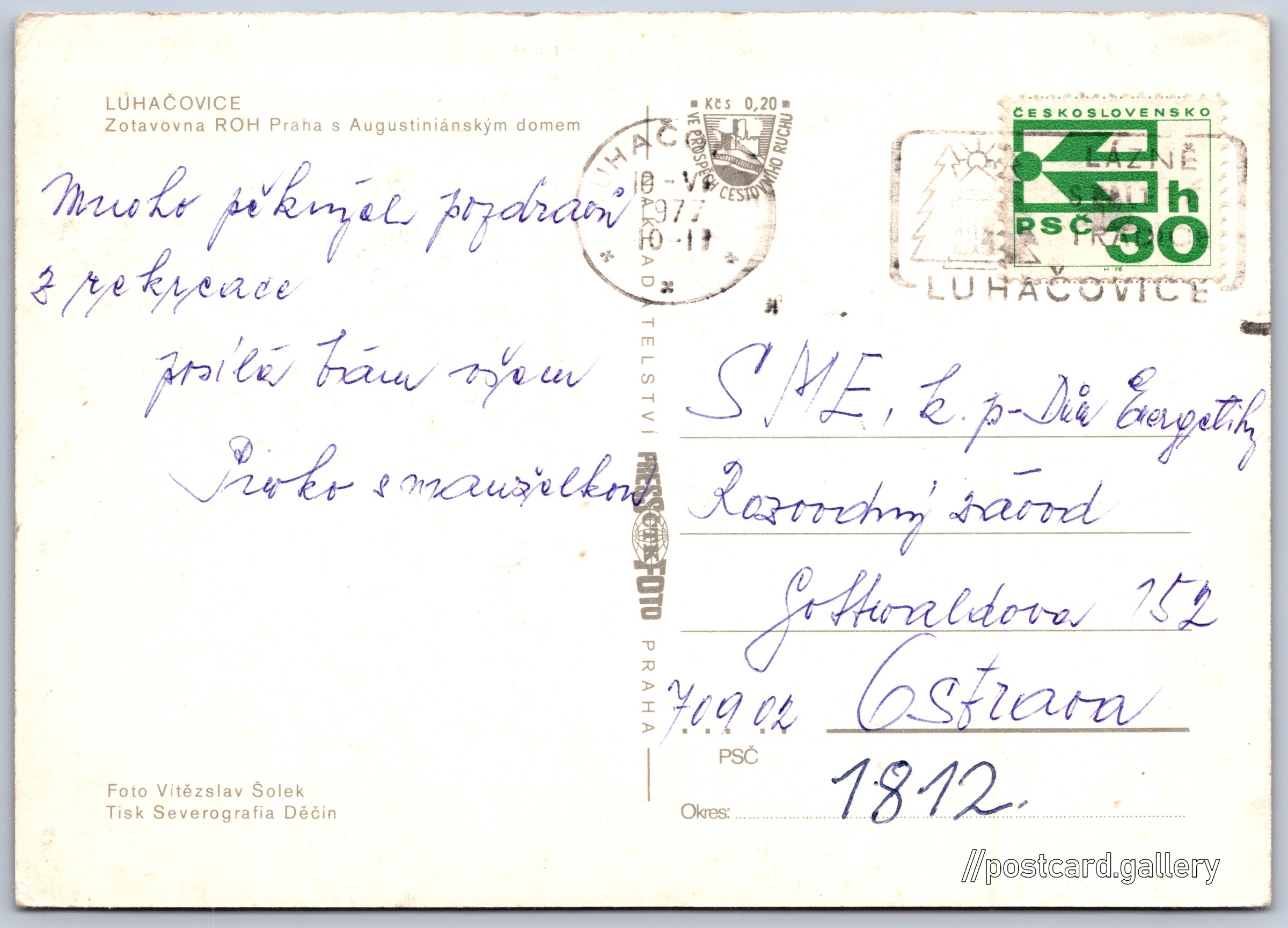 Luhačovice, zotavovna Praha Pokud chcete vidět pohlednice ve vyšším rozlišení nebo zobrazovat jejich zadní stranu, tak se prosím nejdříve přihlašte Přihlásit Zaregistrovat Zotavovna ROH Praha LUHAČOVICEZotavovna ROH Praha s Augustiniánským domem Jazyk tištěného textu na pohlednici: čeština A. Václavíka, Luhačovice, Zlín ukázat na mapě Vydavatel: PressFoto Praha (Československo) Odhadované datum vydání pohlednice: 1974 - 1977 Pomozte nám zpřesnit rok vzniku pohlednice Velikost (š x v) a tvar pohlednice: 148 x 105 mm (5.83" x 4.13"), obdélník Osoby spjaté s touto pohlednicí: Vítězslav Šolek(Autor fotografie) Prošlá poštou:Datum na razítku: 10.6.1977 Ceny: Příplatek na tur. ruch: 0,20 Kčs (CSK))Vyplacené známky: 0,30 Kčs (CSK) DiskuseVložit příspěvek Přidat novou složku ... Spravovat složky ...