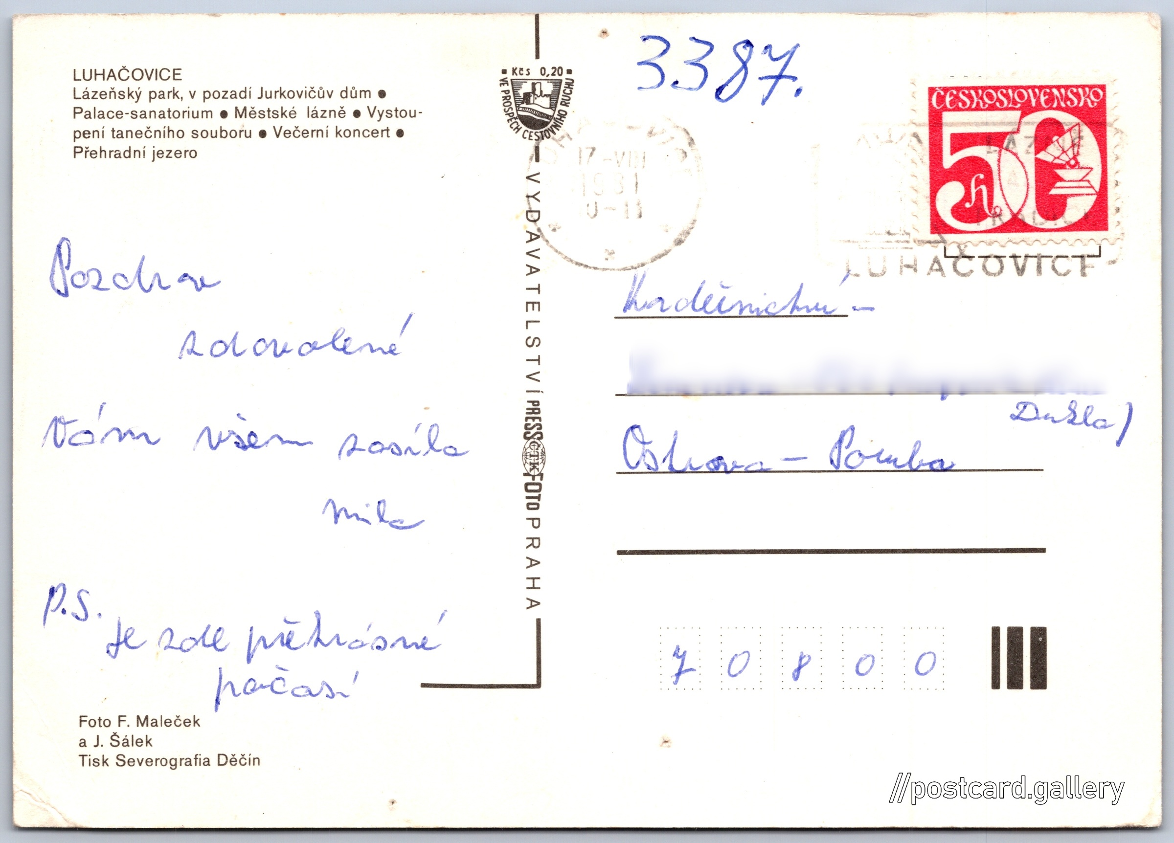 Luhačovice Pokud chcete vidět pohlednice ve vyšším rozlišení nebo zobrazovat jejich zadní stranu, tak se prosím nejdříve přihlašte Přihlásit Zaregistrovat Luhačovice LUHAČOVICE- Lázeňský park, v pozadí Jurkovičův dům- Palace-sanatorium- Městské lázně- Vystoupení tanečního souboru- Večerní koncert- Přehradní jezero Jazyk tištěného textu na pohlednici: čeština Nábřeží, Luhačovice, Zlín ukázat na mapě Vydavatel: PressFoto Praha (Československo) Odhadované datum vydání pohlednice: 1978 - 1981 Pomozte nám zpřesnit rok vzniku pohlednice Velikost (š x v) a tvar pohlednice: 148 x 105 mm (5.83" x 4.13"), obdélník Osoby spjaté s touto pohlednicí: František Maleček(Autor fotografie) Jaroslav Šálek(Autor fotografie) Prošlá poštou:Datum na razítku: 17.8.1981 Ceny: Příplatek na tur. ruch: 0,20 Kčs (CSK))Vyplacené známky: 0,50 Kčs (CSK) DiskuseVložit příspěvek Přidat novou složku ... Spravovat složky ...