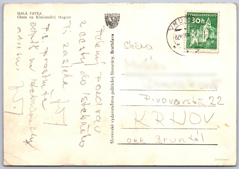 Malá Fatra, chata na Klačianskej Magure Pokud chcete vidět pohlednice ve vyšším rozlišení nebo zobrazovat jejich zadní stranu, tak se prosím nejdříve přihlašte Přihlásit Zaregistrovat MALÁ FATRAChata na Kľačianskej Magure Jazyk tištěného textu na pohlednici: slovenština Chata pod Kľačianskou Magurou, Chata, bouda, Turčianske Kľačany 390, Turčianske Kľačany, Slovensko ukázat na mapě Vydavatel: VPL (Československo) Odhadované datum vydání pohlednice: 1960 - 1963 Pomozte nám zpřesnit rok vzniku pohlednice Velikost (š x v) a tvar pohlednice: 147 x 102 mm (5.79" x 4.02"), obdélník Prošlá poštou:Datum na razítku: 22.7.1963 Ceny: Příplatek na tur. ruch: 0,20 Kčs (CSK))Vyplacené známky: 0,30 Kčs (CSK) DiskuseVložit příspěvek Přidat novou složku ... Spravovat složky ...
