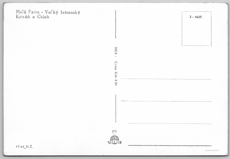 Malá Fatra, Chleb Pokud chcete vidět pohlednice ve vyšším rozlišení nebo zobrazovat jejich zadní stranu, tak se prosím nejdříve přihlašte Přihlásit Zaregistrovat Malá Fatra - Vel'ký fatranský Kriváň a Chleb Jazyk tištěného textu na pohlednici: slovenština Velký Kriváň (1708 m), Hora, výškový bod, Turany, Slovensko ukázat na mapě V blízkém okolí místa zobrazeného na pohlednici lze najít 16 jiných pohlednic. Zobrazit blízké pohlednice Vydavatel: Tatran (Československo) Odhadované datum vydání pohlednice: 1950 - 1953 Pomozte nám zpřesnit rok vzniku pohlednice Velikost (š x v) a tvar pohlednice: 146 x 99 mm (5.75" x 3.90"), obdélník Čistá pohlednice (neprošlá poštou) Ceny: Cena pohlednice: 3,50 Kčs (CSK) Kódy na pohlednici: 17-64 Sl.Ž. 5605 3-4605 DiskuseVložit příspěvek Přidat novou složku ... Spravovat složky ...