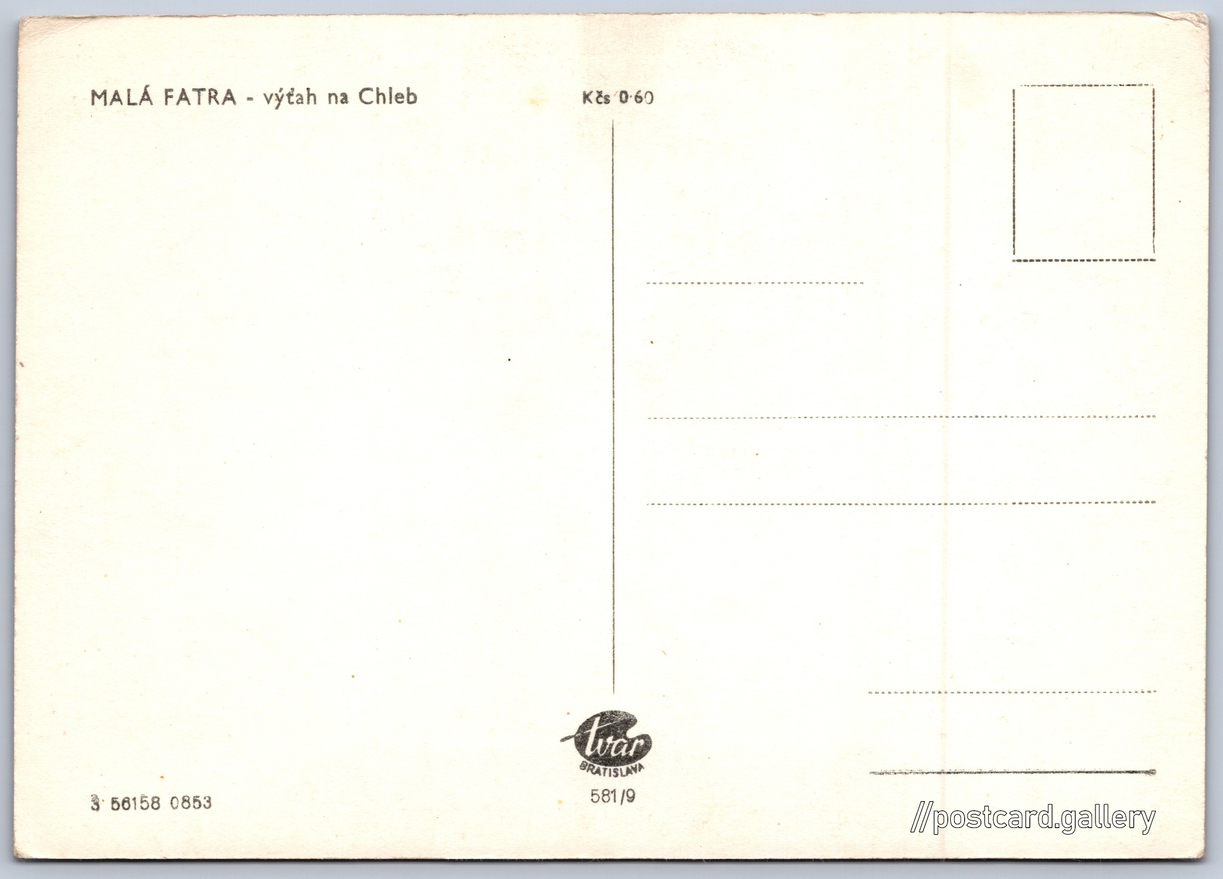 Malá Fatra, lanovka na Chleb Pokud chcete vidět pohlednice ve vyšším rozlišení nebo zobrazovat jejich zadní stranu, tak se prosím nejdříve přihlašte Přihlásit Zaregistrovat MALÁ FATRA - výťah na Chleb Jazyk tištěného textu na pohlednici: slovenština Terchová ukázat na mapě Vydavatel: Tvar Bratislava (Československo) Rok vydání pohlednice: srpen, 1953 Velikost (š x v) a tvar pohlednice: 148 x 105 mm (5.83" x 4.13"), obdélník Čistá pohlednice (neprošlá poštou) Ceny: Cena pohlednice: 0,60 Kčs (CSK) Kódy na pohlednici: 3 56158 0853 581/9 DiskuseVložit příspěvek Přidat novou složku ... Spravovat složky ...