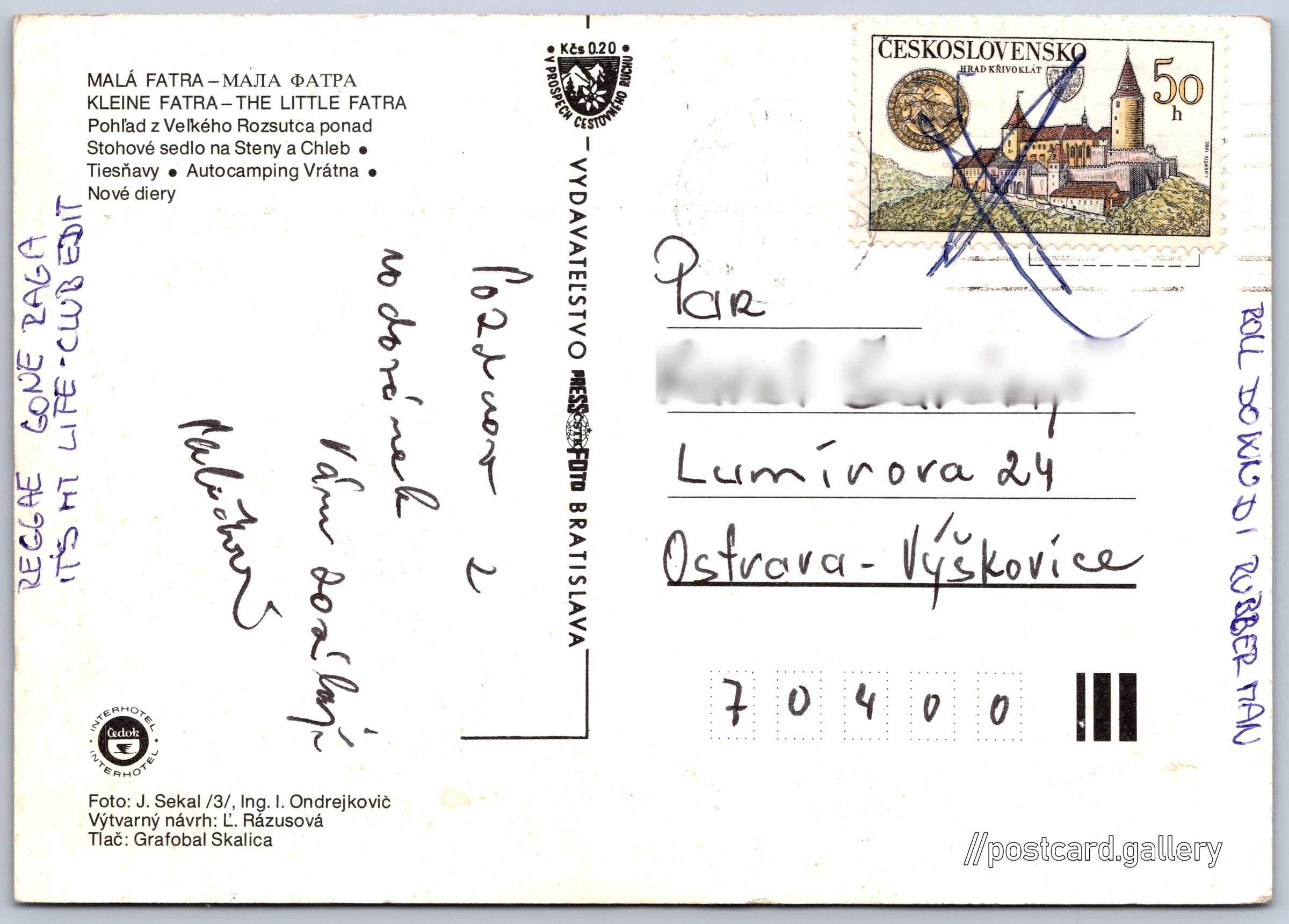 Malá Fatra, Vrátna dolina Pokud chcete vidět pohlednice ve vyšším rozlišení nebo zobrazovat jejich zadní stranu, tak se prosím nejdříve přihlašte Přihlásit Zaregistrovat Vrátna dolina MALÁ FATRA - МАЛА ФАТРАKLEINE FATRA - THE LITTLE FATRA- Pohľad z Veľkého Rozsutca ponad Stohové sedlo na Steny a Chleb- Tiesňavy- Autocamping Vrátna- Nové diery Jazyky tištěného textu na pohlednici: slovenština, ruština, němčina, angličtina Stohové sedlo (1230 m), Horské sedlo, Terchová, Slovensko ukázat na mapě Vydavatel: PressFoto Bratislava (Československo) Datum vydání není známo Pomozte nám odhadnout datum vzniku pohlednice Velikost (š x v) a tvar pohlednice: 148 x 105 mm (5.83" x 4.13"), obdélník Osoby spjaté s touto pohlednicí: Josef Sekal(Autor fotografie) Ivan Ondrejkovič(Autor fotografie) Ľ. Rázusová(Design pohlednice) Prošlá poštou Ceny: Příplatek na tur. ruch: 0,20 Kčs (CSK))Vyplacené známky: 0,50 Kčs (CSK) DiskuseVložit příspěvek Přidat novou složku ... Spravovat složky ...