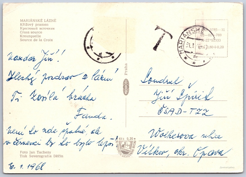 Mariánské Lázně, Křížový pramen Pokud chcete vidět pohlednice ve vyšším rozlišení nebo zobrazovat jejich zadní stranu, tak se prosím nejdříve přihlašte Přihlásit Zaregistrovat MARIÁNSKÉ LÁZNĚ- Křížový pramen- Крестовый источник- Cross source- Kreuzquelle- Source de la Croix Jazyky tištěného textu na pohlednici: čeština, ruština, angličtina, němčina, francouzština, francouzština Mariánské Lázně, Cheb ukázat na mapě V blízkém okolí místa zobrazeného na pohlednici lze najít 52 jiných pohlednic. Zobrazit blízké pohlednice Vydavatel: PressFoto Praha (Československo) Rok vydání pohlednice: 1967 Velikost (š x v) a tvar pohlednice: 148 x 105 mm (5.83" x 4.13"), obdélník Osoby spjaté s touto pohlednicí: Jan Tachezy(Autor fotografie) Prošlá poštou:Datum na razítku: 31.1.1968Datum napsání pohledu: 31.1.1968 Ceny: Cena pohlednice: 0,80 Kčs (CSK) (+0,20 Kčs přípl. na tur. ruch) Kódy na pohlednici: •Om 3785-31 03-02-769 A-22*51333 DiskuseVložit příspěvek Přidat novou složku ... Spravovat složky ...