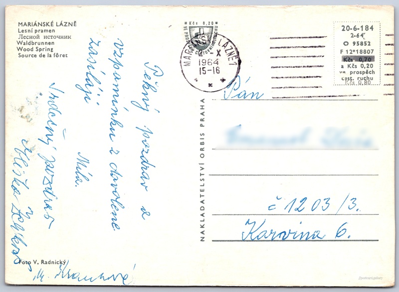 Mariánské Lázně, Lesní pramen Pokud chcete vidět pohlednice ve vyšším rozlišení nebo zobrazovat jejich zadní stranu, tak se prosím nejdříve přihlašte Přihlásit Zaregistrovat MARIÁNSKÉ LÁZNĚ- Lesní pramen- Лесной источник- Waldbrunnen- Wood Spring- Source de la fôret Jazyky tištěného textu na pohlednici: čeština, ruština, němčina, angličtina, francouzština, francouzština Mariánské Lázně, Cheb ukázat na mapě V blízkém okolí místa zobrazeného na pohlednici lze najít 52 jiných pohlednic. Zobrazit blízké pohlednice Vydavatel: Nakladatelství Orbis (Československo) Rok vydání pohlednice: únor, 1964 Velikost (š x v) a tvar pohlednice: 146 x 105 mm (5.75" x 4.13"), obdélník Osoby spjaté s touto pohlednicí: Viktor Radnický(Autor fotografie) Prošlá poštou:Datum na razítku: 2.10.1964 Ceny: Cena pohlednice: 0,80 Kčs (CSK) (+0,20 Kčs přípl. na tur. ruch) Kódy na pohlednici: 20-6-184 2-64 O 95852 F 12*18807 DiskuseVložit příspěvek Přidat novou složku ... Spravovat složky ...