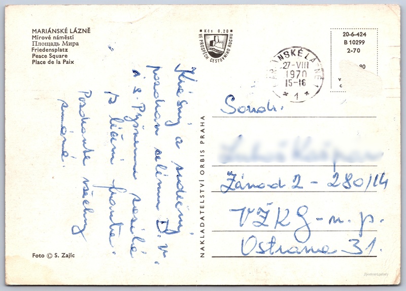 Mariánské Lázně, Mírové náměstí Pokud chcete vidět pohlednice ve vyšším rozlišení nebo zobrazovat jejich zadní stranu, tak se prosím nejdříve přihlašte Přihlásit Zaregistrovat MARIÁNSKÉ LÁZNĚ- Mírové náměstí- Площадь Мира- Friedensplatz- Peace Square- Place de la Paix Jazyky tištěného textu na pohlednici: čeština, ruština, němčina, angličtina, francouzština, francouzština Mírové náměstí, Mariánské Lázně, Cheb ukázat na mapě V blízkém okolí místa zobrazeného na pohlednici lze najít 52 jiných pohlednic. Zobrazit blízké pohlednice Vydavatel: Nakladatelství Orbis (Československo) Rok vydání pohlednice: únor, 1970 Velikost (š x v) a tvar pohlednice: 149 x 105 mm (5.87" x 4.13"), obdélník Osoby spjaté s touto pohlednicí: Stanislav Zajic(Autor fotografie) Prošlá poštou:Datum na razítku: 27.8.1970 Ceny: Cena pohlednice: 0,80 Kčs (CSK) (+0,20 Kčs přípl. na tur. ruch) Kódy na pohlednici: 20-6-424 B 10299 2-70 DiskuseVložit příspěvek Přidat novou složku ... Spravovat složky ...