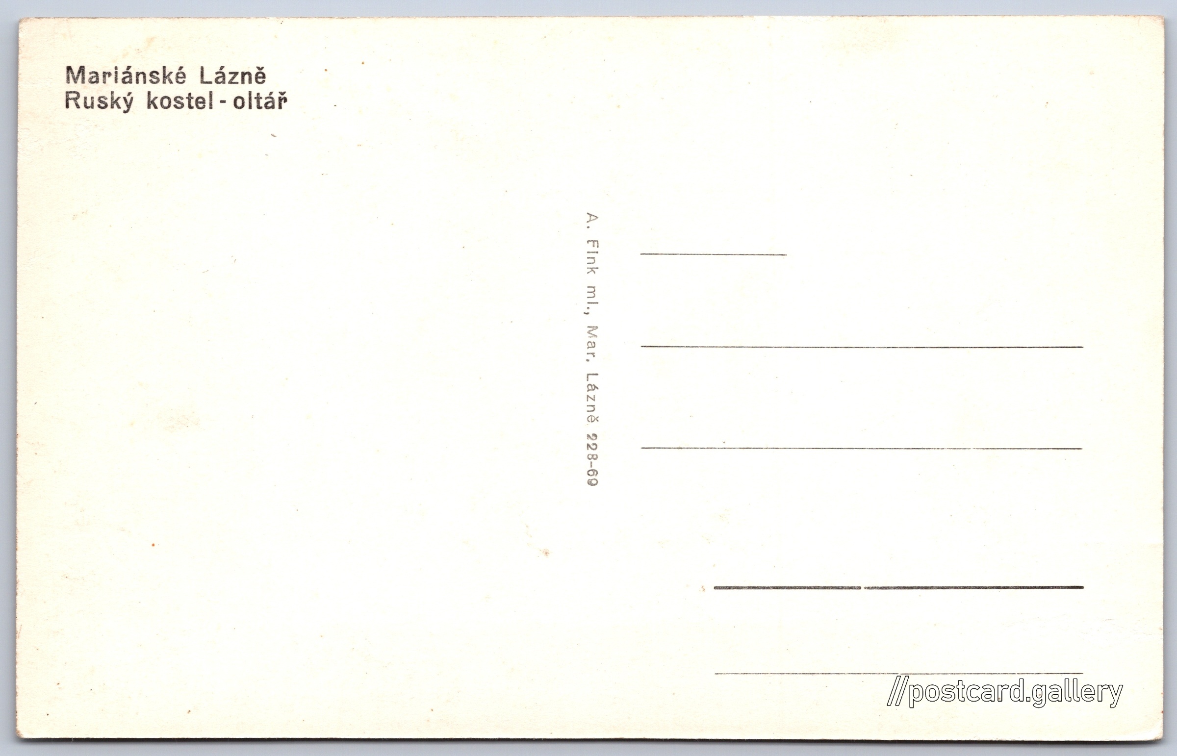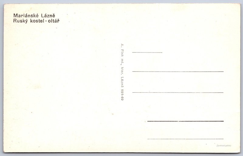 Mariánské lázně, Ruský kostel Pokud chcete vidět pohlednice ve vyšším rozlišení nebo zobrazovat jejich zadní stranu, tak se prosím nejdříve přihlašte Přihlásit Zaregistrovat Mariánské LázněRuský kostel - oltář Jazyk tištěného textu na pohlednici: čeština Pravoslavný kostel sv. Vladimíra, Kostel, Ruská 347/9, Mariánské Lázně, Česko ukázat na mapě V blízkém okolí místa zobrazeného na pohlednici lze najít 52 jiných pohlednic. Zobrazit blízké pohlednice Vydavatel: A. Fink ml. (Československo) Datum vydání není známo Pomozte nám odhadnout datum vzniku pohlednice Velikost (š x v) a tvar pohlednice: 138 x 88 mm (5.43" x 3.46"), obdélník Čistá pohlednice (neprošlá poštou) Kódy na pohlednici: 228-69 DiskuseVložit příspěvek Přidat novou složku ... Spravovat složky ...