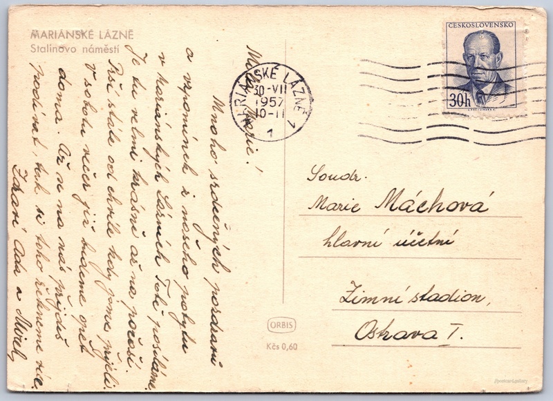 Mariánské Lázně, Stalinovo náměstí Pokud chcete vidět pohlednice ve vyšším rozlišení nebo zobrazovat jejich zadní stranu, tak se prosím nejdříve přihlašte Přihlásit Zaregistrovat MARIÁNSKÉ LÁZNĚStalinovo náměstí Jazyk tištěného textu na pohlednici: čeština Mírové náměstí, Mariánské Lázně, Cheb ukázat na mapě V blízkém okolí místa zobrazeného na pohlednici lze najít 52 jiných pohlednic. Zobrazit blízké pohlednice Vydavatel: Nakladatelství Orbis (Československo) Odhadované datum vydání pohlednice: 1954 - 1957 Pomozte nám zpřesnit rok vzniku pohlednice Velikost (š x v) a tvar pohlednice: 147 x 105 mm (5.79" x 4.13"), obdélník Prošlá poštou:Datum na razítku: 30.7.1957 Ceny: Cena pohlednice: 0,60 Kčs (CSK)Vyplacené známky: 0,30 Kčs (CSK) DiskuseVložit příspěvek Přidat novou složku ... Spravovat složky ...