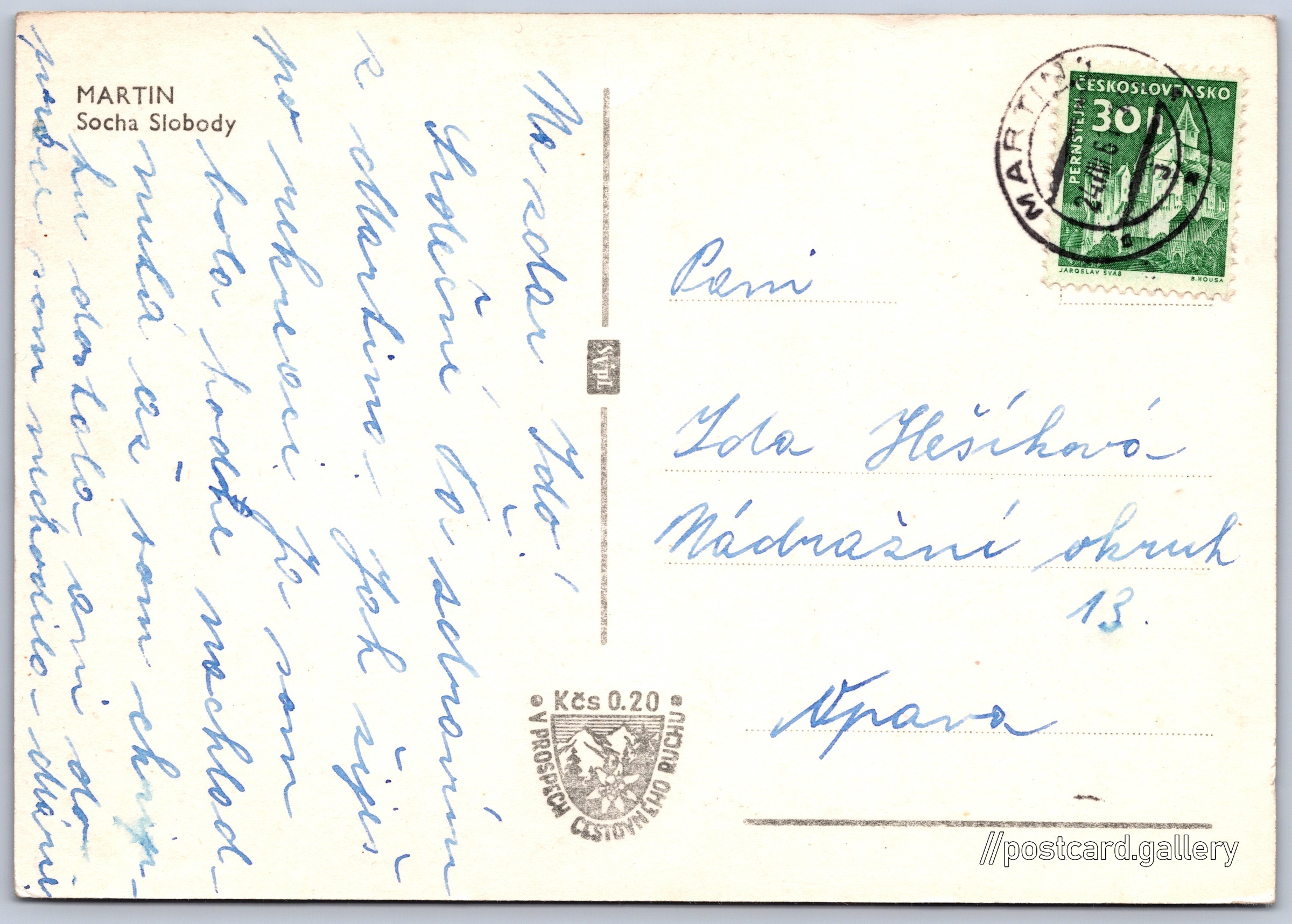 Martin, Socha svobody Pokud chcete vidět pohlednice ve vyšším rozlišení nebo zobrazovat jejich zadní stranu, tak se prosím nejdříve přihlašte Přihlásit Zaregistrovat MARTINSocha Slobody Jazyk tištěného textu na pohlednici: slovenština Podháj-Stráne ukázat na mapě Přesné místo není známo. Pokud jej znáte, tak jej prosím napište do komentářů nebo označte na mapě Vydavatel: VPL (Československo) Odhadované datum vydání pohlednice: 1958 - 1961 Pomozte nám zpřesnit rok vzniku pohlednice Velikost (š x v) a tvar pohlednice: 146 x 102 mm (5.75" x 4.02"), obdélník Prošlá poštou:Datum na razítku: 24.8.1961 Ceny: Příplatek na tur. ruch: 0,20 Kčs (CSK))Vyplacené známky: 0,30 Kčs (CSK) DiskuseVložit příspěvek Přidat novou složku ... Spravovat složky ...