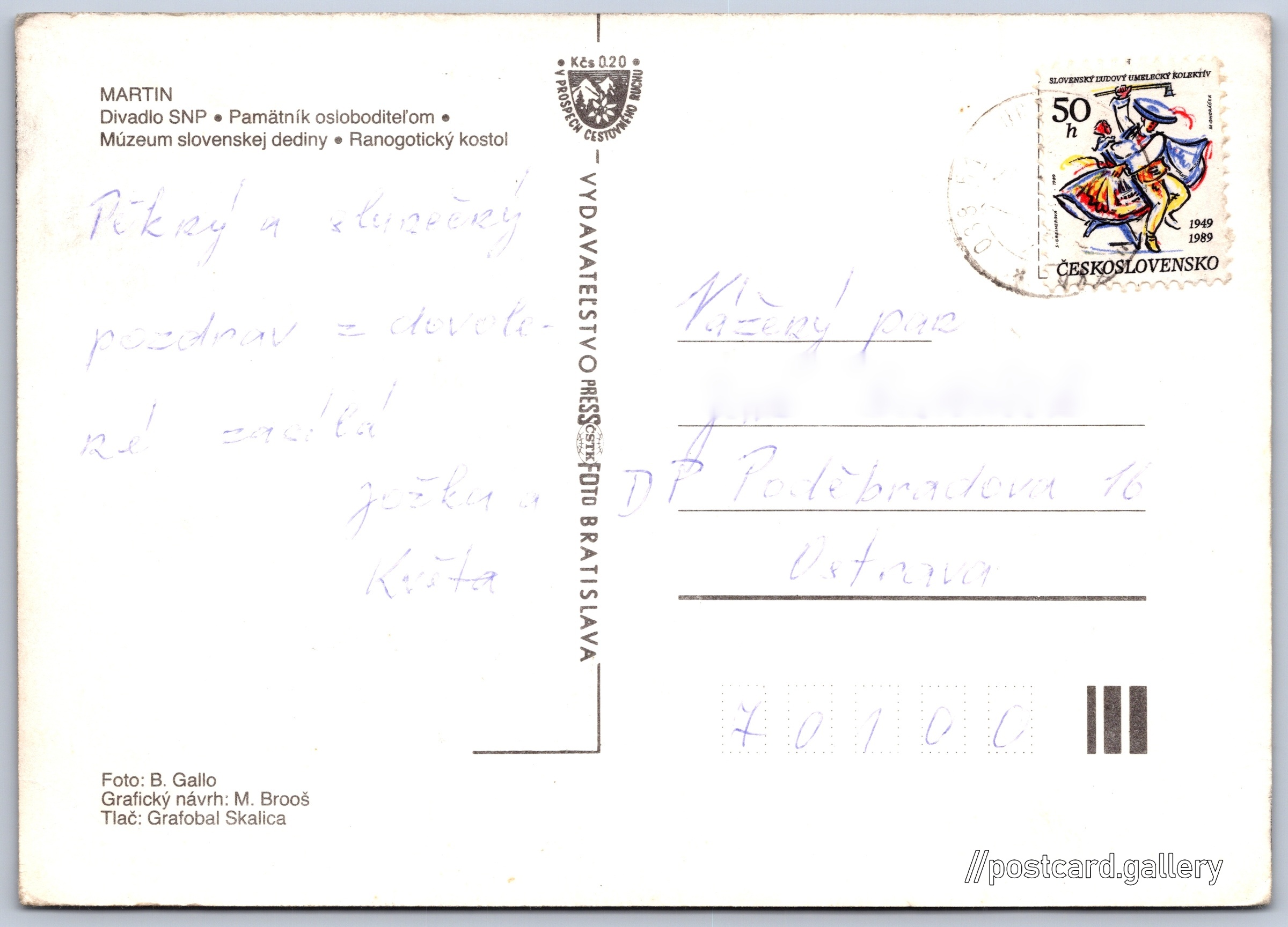 Martin Pokud chcete vidět pohlednice ve vyšším rozlišení nebo zobrazovat jejich zadní stranu, tak se prosím nejdříve přihlašte Přihlásit Zaregistrovat Martin MARTIN- Divadlo SNP- Pamätník osloboditeľom- Múzeum slovenskej dediny- Ranogotický kostol Jazyk tištěného textu na pohlednici: slovenština Divadelné námestie ukázat na mapě Vydavatel: PressFoto Bratislava (Československo) Odhadované datum vydání pohlednice: 1987 - 1989 Pomozte nám zpřesnit rok vzniku pohlednice Velikost (š x v) a tvar pohlednice: 147 x 105 mm (5.79" x 4.13"), obdélník Osoby spjaté s touto pohlednicí: B. Gallo(Autor fotografie) M. Brooš(Design pohlednice) Prošlá poštou Ceny: Příplatek na tur. ruch: 0,20 Kčs (CSK))Vyplacené známky: 0,50 Kčs (CSK) DiskuseVložit příspěvek Přidat novou složku ... Spravovat složky ...