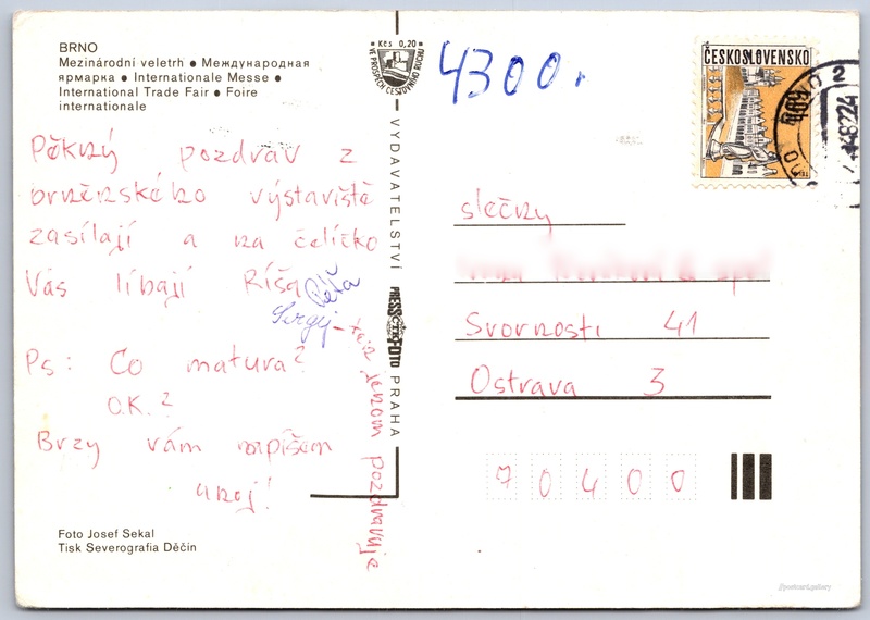 Mezinárodní veletrh Brno Pokud chcete vidět pohlednice ve vyšším rozlišení nebo zobrazovat jejich zadní stranu, tak se prosím nejdříve přihlašte Přihlásit Zaregistrovat Mezinárodní veletrh Brno BRNO- Mezinárodni veletrh- Международная ярмарка- Internationale Messe- International Trade Fair- Foire internationale Jazyky tištěného textu na pohlednici: čeština, ruština, němčina, angličtina, francouzština, francouzština Brno-střed, Brno, Brno-město ukázat na mapě Vydavatel: PressFoto Praha (Československo) Odhadované datum vydání pohlednice: 1979 - 1982 Pomozte nám zpřesnit rok vzniku pohlednice Velikost (š x v) a tvar pohlednice: 148 x 105 mm (5.83" x 4.13"), obdélník Osoby spjaté s touto pohlednicí: Josef Sekal(Autor fotografie) Prošlá poštou:Datum na razítku: 14.4.1982 Ceny: Příplatek na tur. ruch: 0,20 Kčs (CSK))Vyplacené známky: 0,50 Kčs (CSK) DiskuseVložit příspěvek Přidat novou složku ... Spravovat složky ...