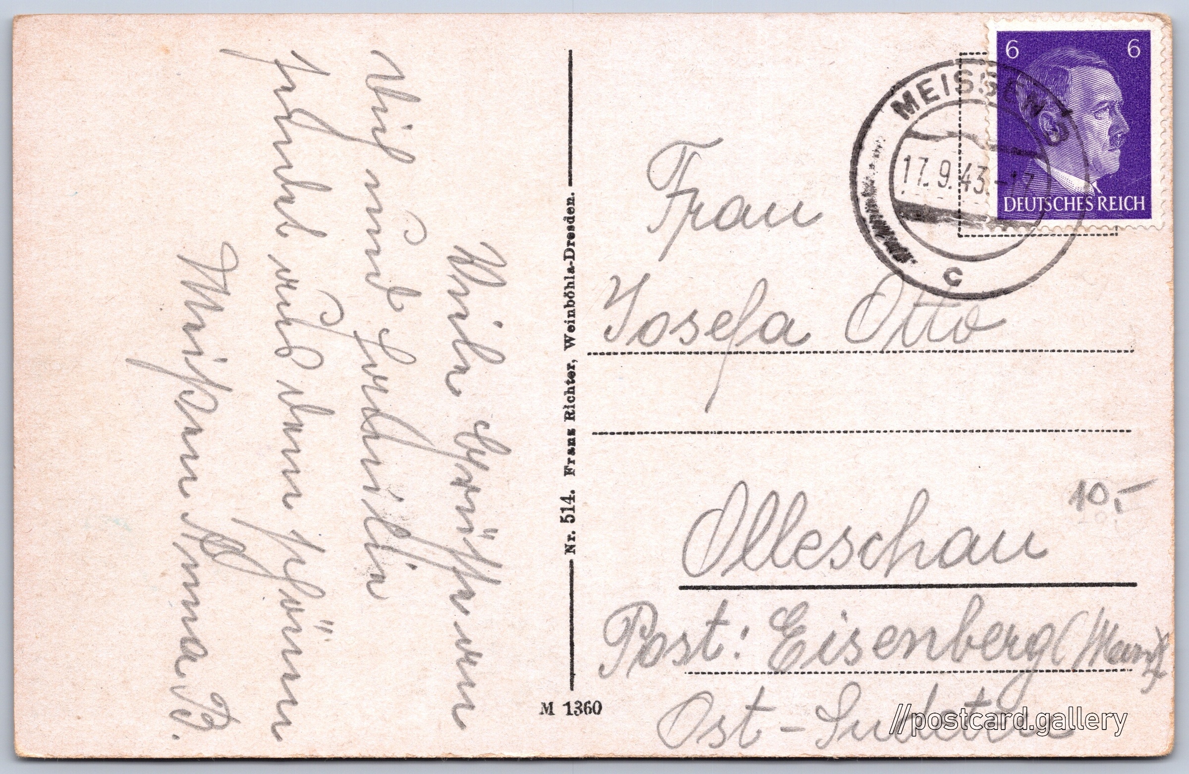 Míšeň, pohled na město Pokud chcete vidět pohlednice ve vyšším rozlišení nebo zobrazovat jejich zadní stranu, tak se prosím nejdříve přihlašte Přihlásit Zaregistrovat Meißen mit Hochuferstraße Jazyk tištěného textu na pohlednici: němčina Elbtalbrücke ukázat na mapě Vydavatel: Franz Richter (Německo) Odhadované datum vydání pohlednice: 1940 - 1943 Pomozte nám zpřesnit rok vzniku pohlednice Velikost (š x v) a tvar pohlednice: 139 x 90 mm (5.47" x 3.54"), obdélník Prošlá poštou:Datum na razítku: 17.9.1943 Ceny: Vyplacené známky: 0,06 ℛℳ (RM) Kódy na pohlednici: M 1360 DiskuseVložit příspěvek Přidat novou složku ... Spravovat složky ...