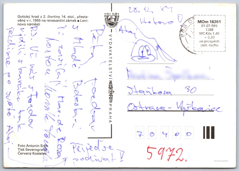 Mladá Boleslav Pokud chcete vidět pohlednice ve vyšším rozlišení nebo zobrazovat jejich zadní stranu, tak se prosím nejdříve přihlašte Přihlásit Zaregistrovat Mladá Boleslav - Gotický hrad z 2. čtvrtiny 14. stol., přestavěný v r. 1555 na renesanční zámek- Leninovo náměstí Jazyk tištěného textu na pohlednici: čeština Staroměstské náměstí 1/55, Mladá Boleslav, 293 01, Mladá Boleslav ukázat na mapě Vydavatel: PressFoto Praha (Československo) Rok vydání pohlednice: 1989 Velikost (š x v) a tvar pohlednice: 148 x 105 mm (5.83" x 4.13"), obdélník Osoby spjaté s touto pohlednicí: V. I. Lenin(Jméno v názvu místa) Antonín Srch(Autor fotografie) Prošlá poštou:Datum napsání pohledu: 28.12.1989 Ceny: Cena pohlednice: 1,40 Kčs (CSK) (+0,20 Kčs přípl. na tur. ruch) Kódy na pohlednici: MOm 16361 01-07-989 1289 DiskuseVložit příspěvek Přidat novou složku ... Spravovat složky ...