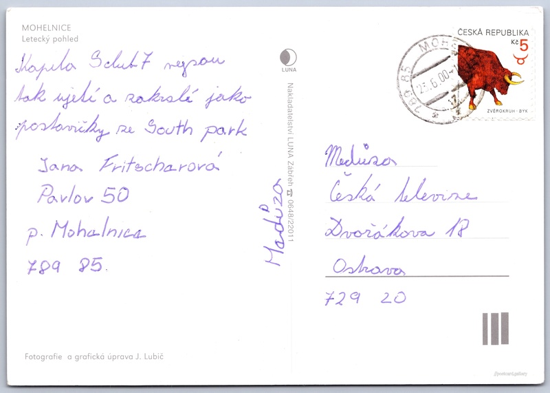 Mohelnice Pokud chcete vidět pohlednice ve vyšším rozlišení nebo zobrazovat jejich zadní stranu, tak se prosím nejdříve přihlašte Přihlásit Zaregistrovat Mohelnice MOHELNICELetecký pohled Jazyk tištěného textu na pohlednici: čeština Mohelnice, Město, Olomoucký kraj, Česko ukázat na mapě V blízkém okolí místa zobrazeného na pohlednici lze najít 2 jiné pohlednice. Zobrazit blízké pohlednice Vydavatel: Nakladatelství LUNA (Česko) Odhadované datum vydání pohlednice: 1997 - 2000 Pomozte nám zpřesnit rok vzniku pohlednice Velikost (š x v) a tvar pohlednice: 147 x 104 mm (5.79" x 4.09"), obdélník Osoby spjaté s touto pohlednicí: Josef Lubič(Autor fotografie) Prošlá poštou:Datum na razítku: 23.6.2000 Ceny: Vyplacené známky: 5,00 Kč (CZK) DiskuseVložit příspěvek Přidat novou složku ... Spravovat složky ...