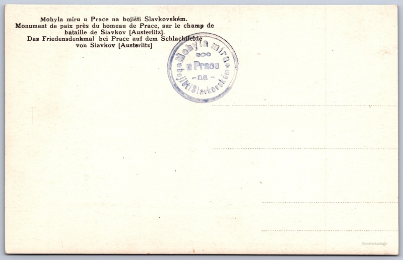 Mohyla míru u Prace Pokud chcete vidět pohlednice ve vyšším rozlišení nebo zobrazovat jejich zadní stranu, tak se prosím nejdříve přihlašte Přihlásit Zaregistrovat Mohyla míru u Prace na bojišti Slavkovském.Monument de paix près du homeau de Prace, sur le champ de bataille de Slavkov (Austerlitz).Das Friedensdenkmal bei Prace auf dem Schlachtfelde von Slavkov (Austerlitz] Jazyky tištěného textu na pohlednici: čeština, francouzština, němčina K Mohyle míru 200, 664 58 Prace, Czechia ukázat na mapě Datum vydání není známo Pomozte nám odhadnout datum vzniku pohlednice Velikost (š x v) a tvar pohlednice: 136 x 86 mm (5.35" x 3.39"), obdélník Čistá pohlednice (neprošlá poštou) DiskuseVložit příspěvek Přidat novou složku ... Spravovat složky ...