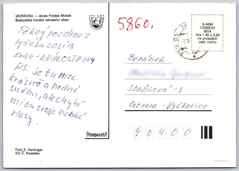 Morávka, okres Frýdek - Místek Pokud chcete vidět pohlednice ve vyšším rozlišení nebo zobrazovat jejich zadní stranu, tak se prosím nejdříve přihlašte Přihlásit Zaregistrovat Morávka MORÁVKA - okres Frýdek-MístekBeskydská horská rekreační obec. Jazyk tištěného textu na pohlednici: čeština Morávka, Obec, Česko ukázat na mapě Vydavatel: Panorama (Československo) Datum vydání není známo Pomozte nám odhadnout datum vzniku pohlednice Velikost (š x v) a tvar pohlednice: 147 x 105 mm (5.79" x 4.13"), obdélník Osoby spjaté s touto pohlednicí: Zd. Hartinger(Autor fotografie) Prošlá poštou Ceny: Cena pohlednice: 1,40 Kčs (CSK) (+0,20 Kčs přípl. na tur. ruch) Kódy na pohlednici: 6-4434 175302101 6014 DiskuseVložit příspěvek Přidat novou složku ... Spravovat složky ...
