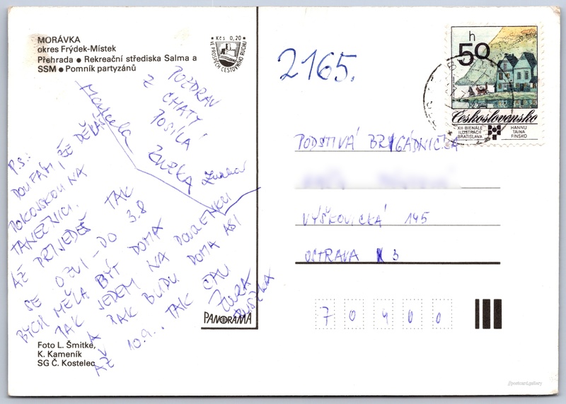 Morávka Pokud chcete vidět pohlednice ve vyšším rozlišení nebo zobrazovat jejich zadní stranu, tak se prosím nejdříve přihlašte Přihlásit Zaregistrovat Morávka MORÁVKAokres Frýdek-Místek- Přehrada- Rekreační střediska Salma a SSM- Pomník partyzánů Jazyk tištěného textu na pohlednici: čeština Morávka, Frýdek-Místek ukázat na mapě Vydavatel: Panorama (Československo) Datum vydání není známo Pomozte nám odhadnout datum vzniku pohlednice Velikost (š x v) a tvar pohlednice: 148 x 105 mm (5.83" x 4.13"), obdélník Osoby spjaté s touto pohlednicí: L. Šmitke(Autor fotografie) K. Kameník(Autor fotografie) Prošlá poštou Ceny: Příplatek na tur. ruch: 0,20 Kčs (CSK))Vyplacené známky: 0,50 Kčs (CSK) DiskuseVložit příspěvek Přidat novou složku ... Spravovat složky ...