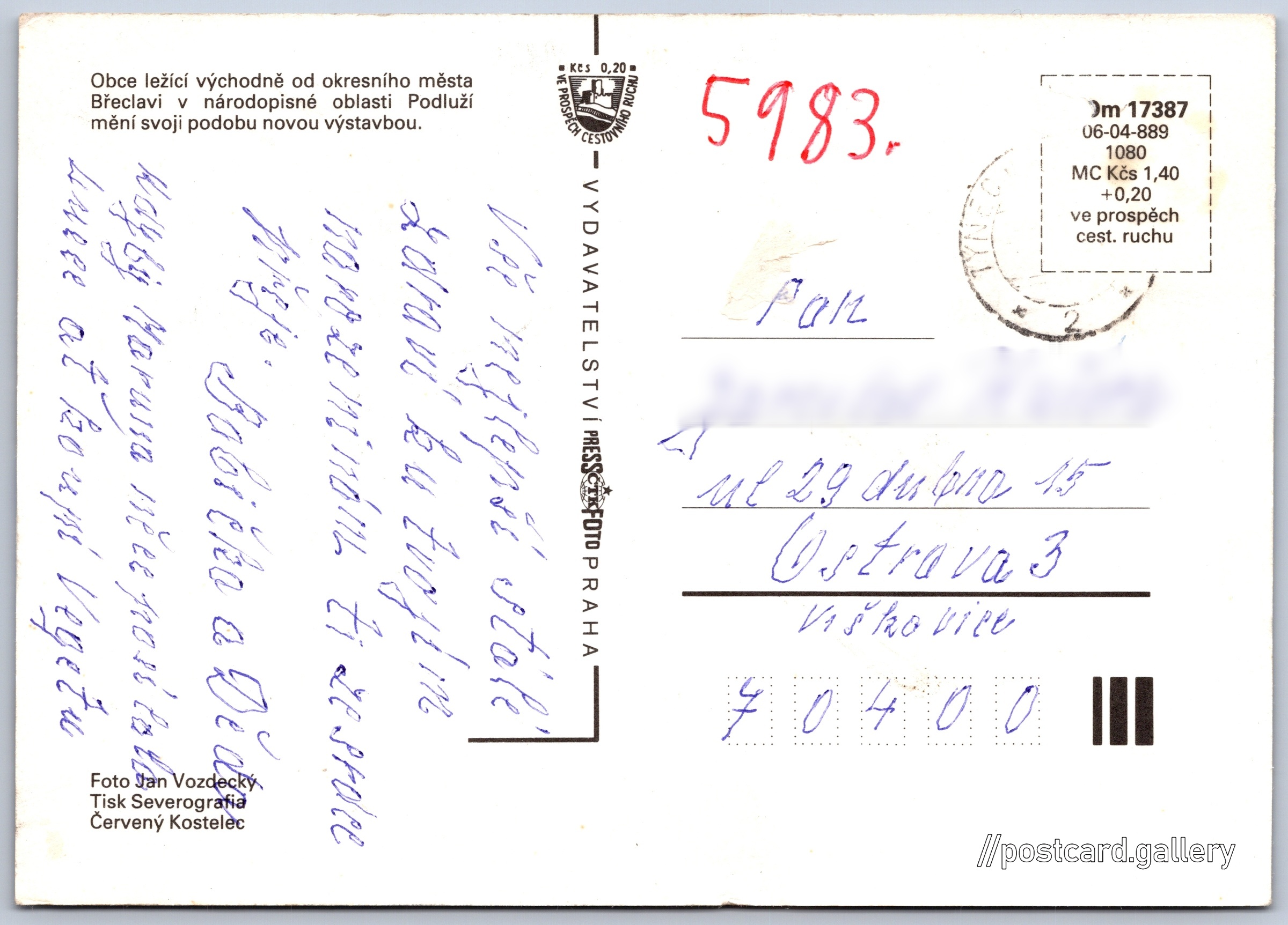 Moravská Nová Ves, Hrušky, Týnec Pokud chcete vidět pohlednice ve vyšším rozlišení nebo zobrazovat jejich zadní stranu, tak se prosím nejdříve přihlašte Přihlásit Zaregistrovat Moravská Nová Ves, Hrušky, Týnec Obce ležící východně od okresního města Břeclavi v národopisné oblasti Podluží mění svoji podobu novou výstavbou. Jazyk tištěného textu na pohlednici: čeština Moravská Nová Ves, Břeclav ukázat na mapě V blízkém okolí místa zobrazeného na pohlednici lze najít 1 jinou pohlednici. Zobrazit blízké pohlednice Vydavatel: PressFoto Praha (Československo) Rok vydání pohlednice: 1988 Velikost (š x v) a tvar pohlednice: 148 x 105 mm (5.83" x 4.13"), obdélník Osoby spjaté s touto pohlednicí: Jan Vozdecký(Autor fotografie) Prošlá poštou Ceny: Cena pohlednice: 1,40 Kčs (CSK) (+0,20 Kčs přípl. na tur. ruch) Kódy na pohlednici: Om 17387 06-04-889 1080 DiskuseVložit příspěvek Přidat novou složku ... Spravovat složky ...