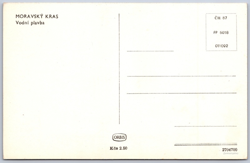 Moravský Kras, vodní plavba Pokud chcete vidět pohlednice ve vyšším rozlišení nebo zobrazovat jejich zadní stranu, tak se prosím nejdříve přihlašte Přihlásit Zaregistrovat MORAVSKÝ KRASVodní plavba Jazyk tištěného textu na pohlednici: čeština Punkevní jeskyně, Jeskyně, Vavřinec, Jihomoravský kraj, Česko ukázat na mapě Vydavatel: Nakladatelství Orbis (Československo) Odhadované datum vydání pohlednice: 1949 - 1953 Pomozte nám zpřesnit rok vzniku pohlednice Velikost (š x v) a tvar pohlednice: 138 x 89 mm (5.43" x 3.50"), obdélník Čistá pohlednice (neprošlá poštou) Ceny: Cena pohlednice: 2,50 Kčs (CSK) Kódy na pohlednici: CH 87 FP 5018 011092 2704700 DiskuseVložit příspěvek Přidat novou složku ... Spravovat složky ...