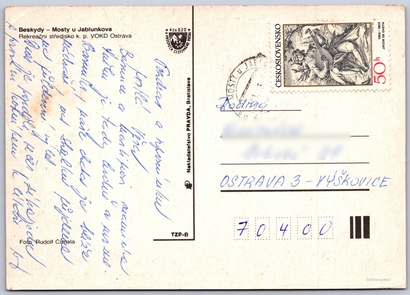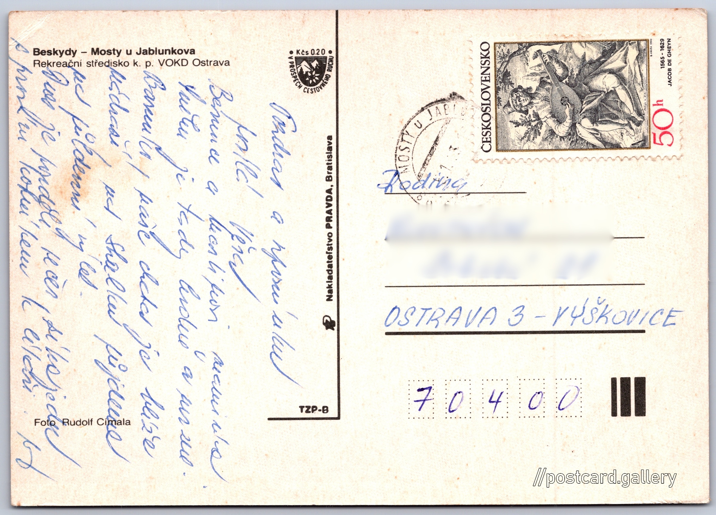 Mosty u Jablunkova Pokud chcete vidět pohlednice ve vyšším rozlišení nebo zobrazovat jejich zadní stranu, tak se prosím nejdříve přihlašte Přihlásit Zaregistrovat Mosty u Jablunkova Beskydy - Mosty u JablunkovaRekreační středisko k. p. VOKD Ostrava Jazyk tištěného textu na pohlednici: čeština Mosty u Jablunkova, Obec, Česko ukázat na mapě Přesné místo není známo. Pokud jej znáte, tak jej prosím napište do komentářů nebo označte na mapě Vydavatel: Nakladateľstvo PRAVDA, Bratislava (Československo) Datum vydání není známo Pomozte nám odhadnout datum vzniku pohlednice Velikost (š x v) a tvar pohlednice: 147 x 103 mm (5.79" x 4.06"), obdélník Osoby spjaté s touto pohlednicí: Rudolf Cimala(Autor fotografie) Prošlá poštou Ceny: Příplatek na tur. ruch: 0,20 Kčs (CSK))Vyplacené známky: 0,50 Kčs (CSK) DiskuseVložit příspěvek Přidat novou složku ... Spravovat složky ...