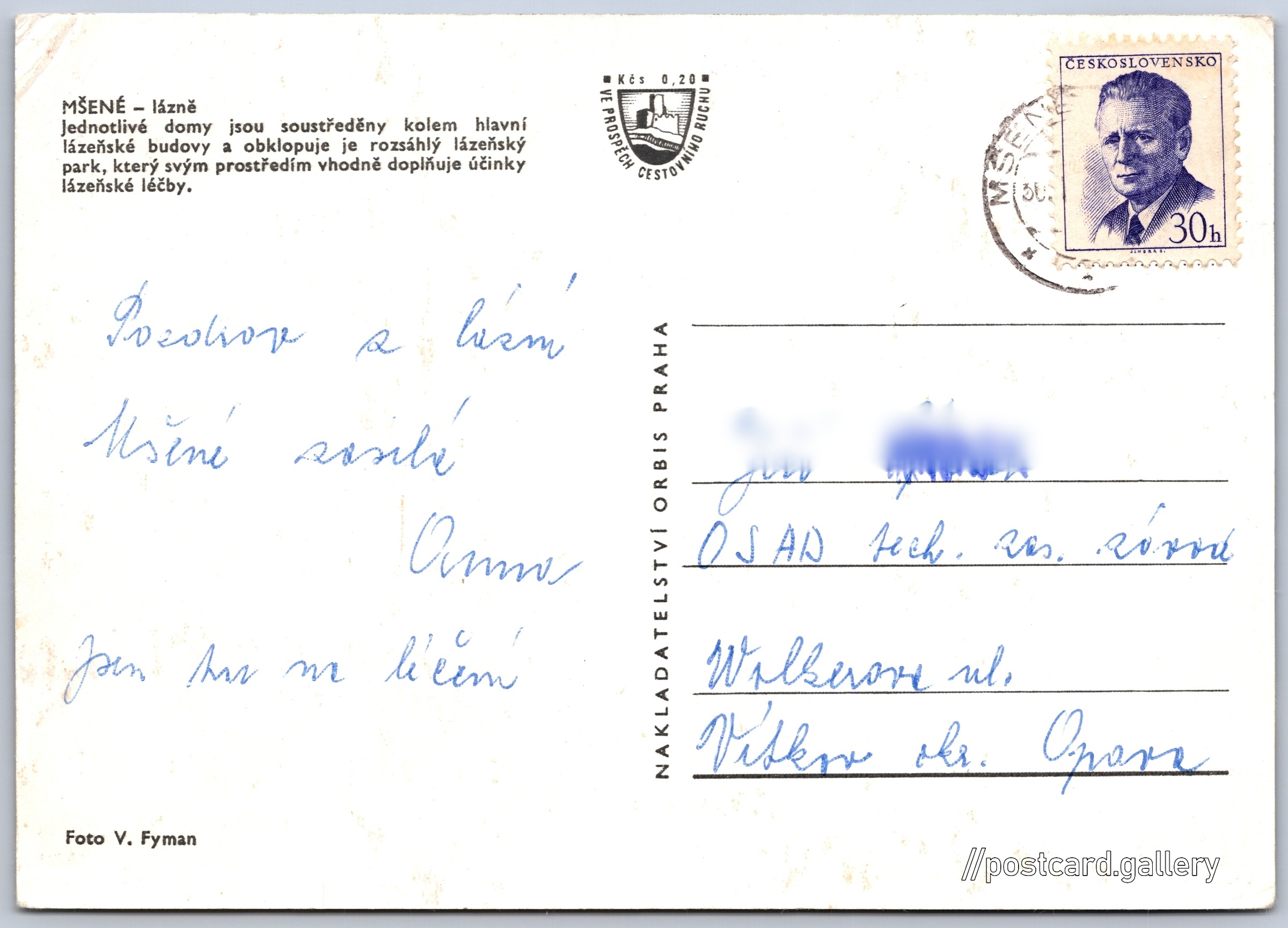 Mšené, lázně Pokud chcete vidět pohlednice ve vyšším rozlišení nebo zobrazovat jejich zadní stranu, tak se prosím nejdříve přihlašte Přihlásit Zaregistrovat MŠENÉ – lázněJednotlivé domy jsou soustředěny kolem hlavní lázeňské budovy a obklopuje je rozsáhlý lázeňský park, který svým prostředím vhodně doplňuje účinky lázeňské léčby. Jazyk tištěného textu na pohlednici: čeština Mšené-lázně, Litoměřice ukázat na mapě V blízkém okolí místa zobrazeného na pohlednici lze najít 3 jiné pohlednice. Zobrazit blízké pohlednice Vydavatel: Nakladatelství Orbis (Československo) Datum vydání není známo Pomozte nám odhadnout datum vzniku pohlednice Velikost (š x v) a tvar pohlednice: 147 x 105 mm (5.79" x 4.13"), obdélník Osoby spjaté s touto pohlednicí: Vladimír Fyman(Autor fotografie) Prošlá poštou Ceny: Příplatek na tur. ruch: 0,20 Kčs (CSK))Vyplacené známky: 0,30 Kčs (CSK) DiskuseVložit příspěvek Přidat novou složku ... Spravovat složky ...
