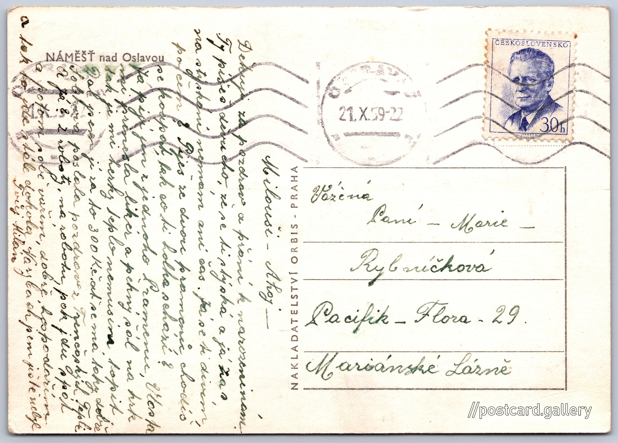 Náměšť nad Oslavou Pokud chcete vidět pohlednice ve vyšším rozlišení nebo zobrazovat jejich zadní stranu, tak se prosím nejdříve přihlašte Přihlásit Zaregistrovat NÁMĚŠŤ nad Oslavou Jazyk tištěného textu na pohlednici: čeština Náměšť nad Oslavou, Třebíč ukázat na mapě V blízkém okolí místa zobrazeného na pohlednici lze najít 3 jiné pohlednice. Zobrazit blízké pohlednice Vydavatel: Nakladatelství Orbis (Československo) Odhadované datum vydání pohlednice: 1956 - 1959 Pomozte nám zpřesnit rok vzniku pohlednice Velikost (š x v) a tvar pohlednice: 146 x 103 mm (5.75" x 4.06"), obdélník Prošlá poštou:Datum na razítku: 21.10.1959 Ceny: Vyplacené známky: 0,30 Kčs (CSK) DiskuseVložit příspěvek Přidat novou složku ... Spravovat složky ...