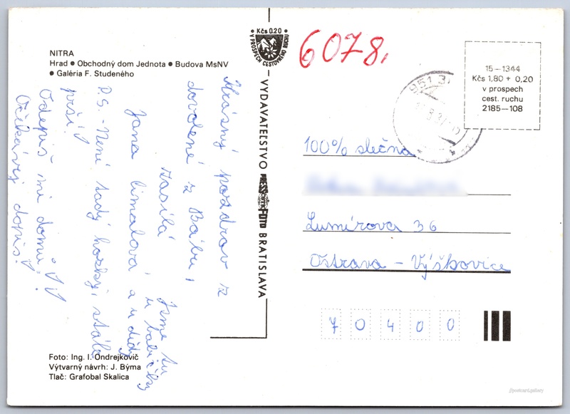 Nitra Pokud chcete vidět pohlednice ve vyšším rozlišení nebo zobrazovat jejich zadní stranu, tak se prosím nejdříve přihlašte Přihlásit Zaregistrovat Nitra NITRA- Hrad- Obchodný dom Jednota- Budova MsNV- Galéria F. Studeného Jazyk tištěného textu na pohlednici: slovenština Nitranský hrad, Zámek, Nitra, Slovensko ukázat na mapě V blízkém okolí místa zobrazeného na pohlednici lze najít 6 jiných pohlednic. Zobrazit blízké pohlednice Vydavatel: PressFoto Bratislava (Československo) Rok vydání pohlednice: 1985 Velikost (š x v) a tvar pohlednice: 147 x 105 mm (5.79" x 4.13"), obdélník Osoby spjaté s touto pohlednicí: J. Býma(Design pohlednice) Ivan Ondrejkovič(Autor fotografie) Prošlá poštou Ceny: Cena pohlednice: 1,80 Kčs (CSK) (+0,20 Kčs přípl. na tur. ruch) Kódy na pohlednici: 15-1344 2185-108 DiskuseVložit příspěvek Přidat novou složku ... Spravovat složky ...